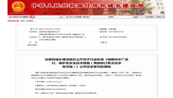 近日,住房和城乡建设部就行业标准《城镇供水厂运行、维护及安全技术规程(局部修订条文征求意见稿)》公开征求意见,本次修订新增和删除了部分内容。各会员单位如有意见和建议,请于8月18日前发送到省水协sdgsxh@163.com邮箱,省水协将认真汇总梳理后报送相关单位。