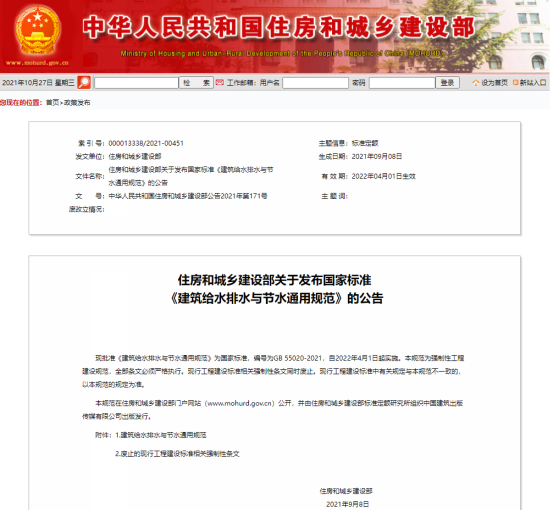 近日,中华人民共和国住房和城乡建设部发文批准《建筑给水排水与节水通用规范》为国家标准,编号为GB 55020-2021,自2022年4月11日起实施。本规范为强制性工程建设规范,全部条文必须严格执行,同时现行的工程建设标准相关强制性条文同时废止。