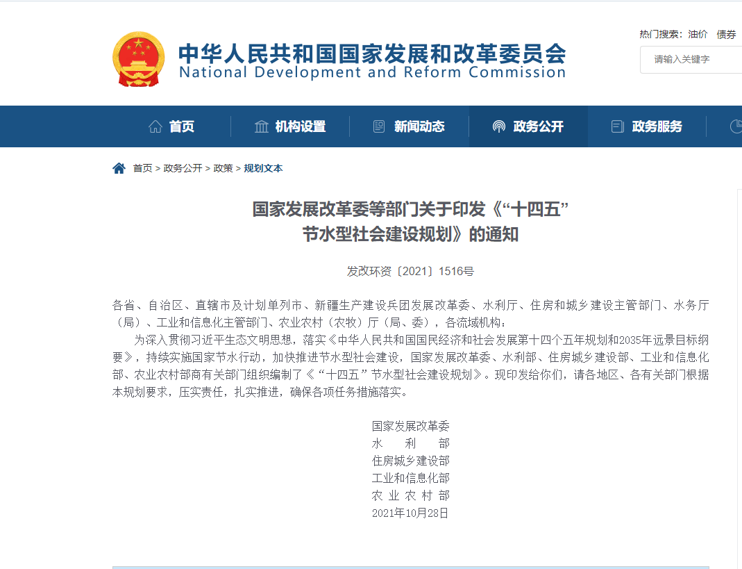 为深入贯彻习近平生态文明思想,全面推进节水型社会建设,近日,国家发展改革委、水利部、住房城乡建设部、工业和信息化部、农业农村部联合印发《“十四五”节水型社会建设规划》(发改环资〔2021〕1516号,以下简称《规划》)。
