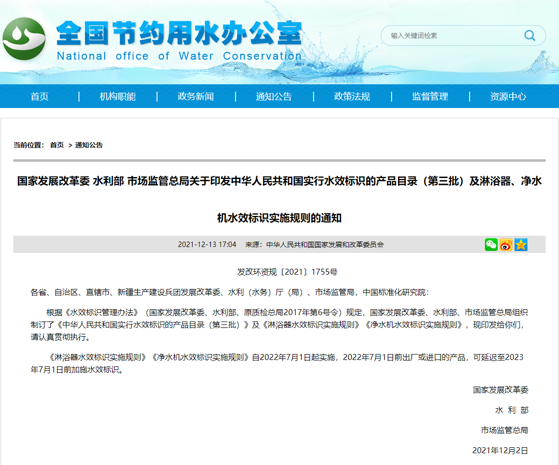 关于印发中华人民共和国实行水效标识的产品目录(第三批)及淋浴器、净水机水效标识实施规则的通知