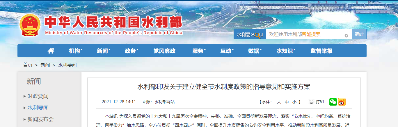 为深入贯彻党的十九大和十九届历次全会精神,完整、准确、全面贯彻新发展理念,落实“节水优先、空间均衡、系统治理、两手发力”治水思路,全方位贯彻“四水四定”原则,全面提升水资源集约节约安全利用水平,推动新阶段水利高质量发展,近日,水利部印发《关于建立健全节水制度政策的指导意见》(以下简称《指导意见》),水利部办公厅印发《“十四五”时期建立健全节水制度政策实施方案》(以下简称《实施方案》),明确了建立健全节水制度政策的主要目标,系统部署各项任务措施。