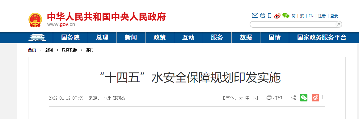 近日,经国务院同意,国家发展改革委、水利部印发《“十四五”水安全保障规划》(以下简称《规划》)。《规划》是国家“十四五”规划体系的重要组成部分,是国家层面首次编制实施的水安全保障五年规划,是“十四五”时期水安全保障工作的重要依据。《规划》在深入调研、系统分析基础上,充分听取有关部门和地方意见,并组织专家论证后报请国务院审批。《规划》系统总结评估水利改革发展“十三五”规划实施情况,以全面提升国家水安全保障能力为主线,以全面推进国家水网工程建设为重点,研究提出了“十四五”水安全保障的总体思路、规划目标、规划任务和保障措施等。
