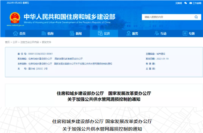 为进一步加强公共供水管网漏损控制,提高水资源利用效率,近日,住房和城乡建设部办公厅、国家发展改革委办公厅联合印发《关于加强公共供水管网漏损控制的通知》(建办城〔2022〕2号),要求到2025年,城市和县城供水管网设施进一步完善,管网压力调控水平进一步提高,激励机制和建设改造、运行维护管理机制进一步健全,供水管网漏损控制水平进一步提升,长效机制基本形成。城市公共供水管网漏损率达到漏损控制及评定标准确定的一级评定标准的地区,进一步降低漏损率;未达到一级评定标准的地区,控制到一级评定标准以内;全国城市公共供水管网漏损率力争控制在9%以内。