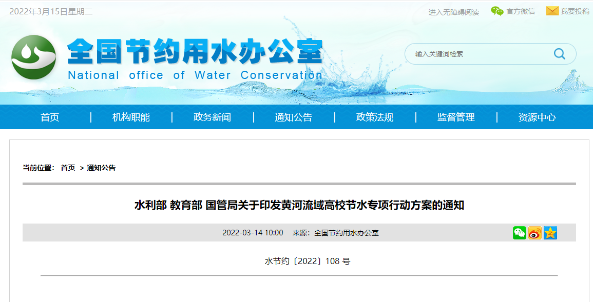 为深入贯彻习近平总书记“节水优先、空间均衡、系统治理、两手发力”的治水思路和黄河流域生态保护和高质量发展重要讲话精神,落实《黄河流域生态保护和高质量发展规划纲要》,近日,水利部、教育部、国管局联合印发《黄河流域高校节水专项行动方案》(以下简称《方案》)。