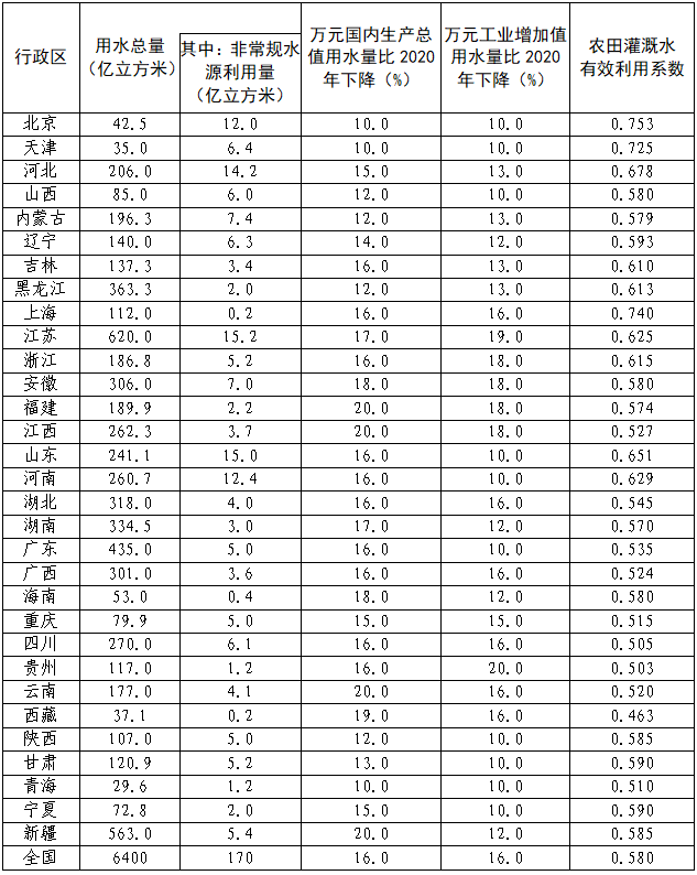为持续实施水资源消耗总量和强度双控行动,根据《国家节水行动方案》和《实行最严格水资源管理制度考核办法》相关要求,水利部商国家发展改革委组织制定了各省、自治区、直辖市“十四五”用水总量和强度双控目标,现印发你们,请严格贯彻执行,并于2022年4月底前将各个年度的用水强度控制目标(含非常规水源利用量)报水利部备案,逾期未备案的按五年平均降幅(增幅)考虑。各个年度的用水总量控制目标同“十四五”期末用水总量控制目标。
