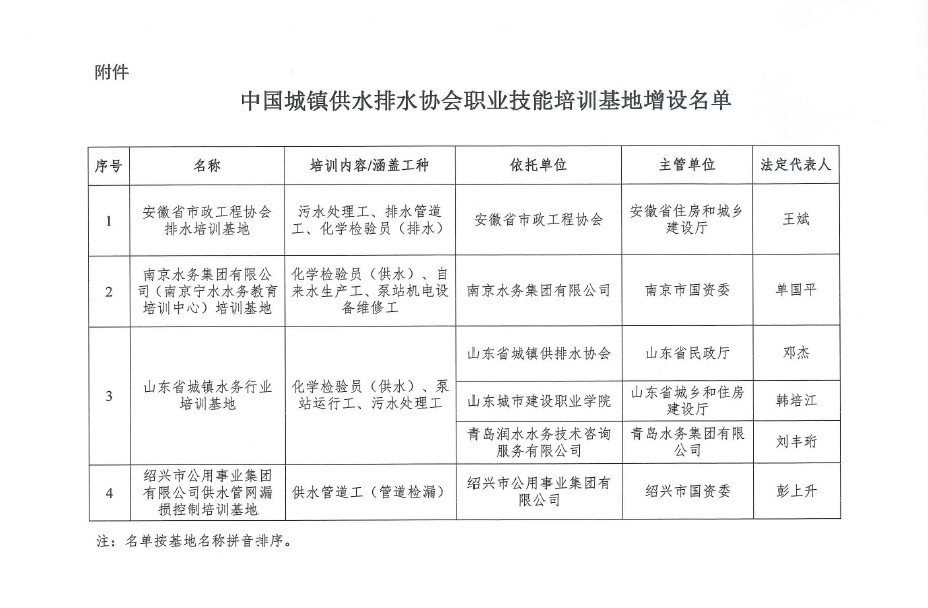 据悉,中国城镇供水排水协会职业技能培训基地是经中国城镇供水排水协会评审认定并挂牌的、开展水务行业人才教育培训和职业技能等级认定工作的专门培训机构。目前,中国城镇供水排水协会已公示9个职业技能培训基地,包括:安徽省城镇供水协会培训中心、北京排水集团职业技能培训学校、重庆市水务行业职业技能培训中心、首创股份培训基地、四川省城镇供水排水协会/兴蓉环境股份有限公司西南培训基地、安徽省市政工程协会排水培训基地、南京水务集团有限公司(南京宁水水务教育培训中心)培训基地、山东省城镇水务行业培训基地和绍兴市公用事业集团有限公司供水管网漏损控制培训基地。
