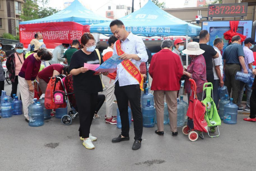 6月13日,胶州市中云街道办事处忠观悦府小区的居民们陆续赶来,他们有的在办理供水业务,有的咨询家庭用水问题,有的向志愿人员询问如何通过网上缴纳水费,还有的拿着水桶来接山泉水,到处都是一派忙碌的景象。
