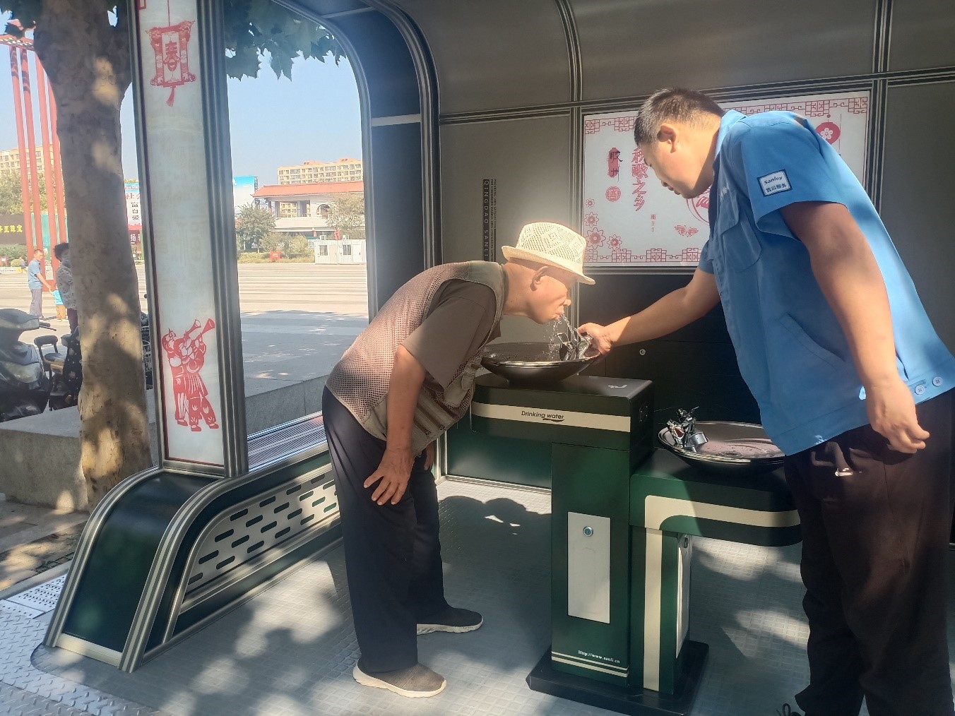 据了解,景观饮水亭内设置饮水台,饮水台接水盆造型人性化,防止水溅、便于流水排放;饮水台设置一高一低两个水盆,采用统一定制高度,在常规使用中可满足不同身高人群使用;饮水台各有两个出水口,分别为温水和凉水,可供市民选择。景观饮水亭不仅能够让市民方便、快捷、安全地喝到纯净的饮用水,还能极大减少乱丢塑料水瓶、一次性水杯造成的环境污染。此外,景观饮水亭还配有休息条椅、USB手机充电插口等设施一应俱全,接水的同时可供市民短暂休息。