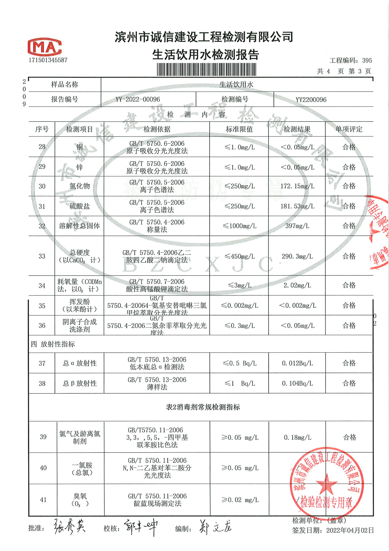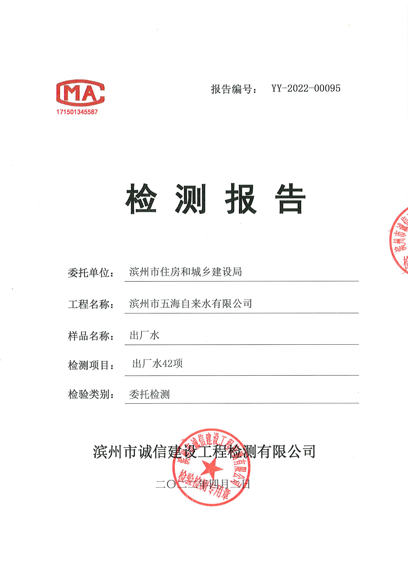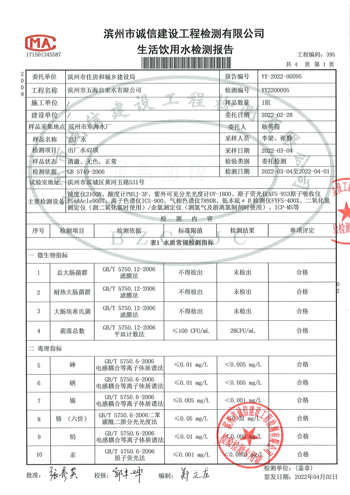 2022年第一季度出厂水42项检测报告