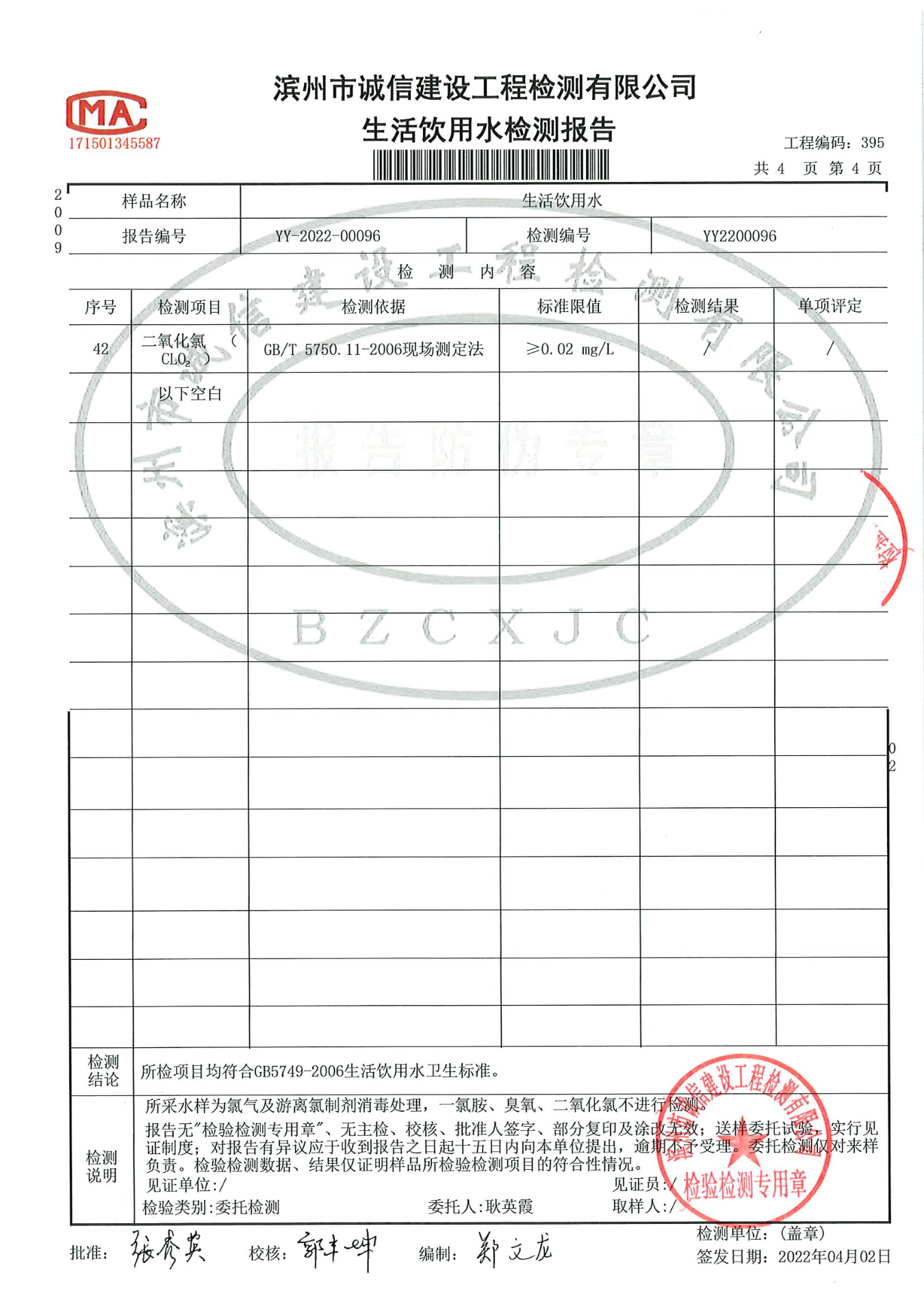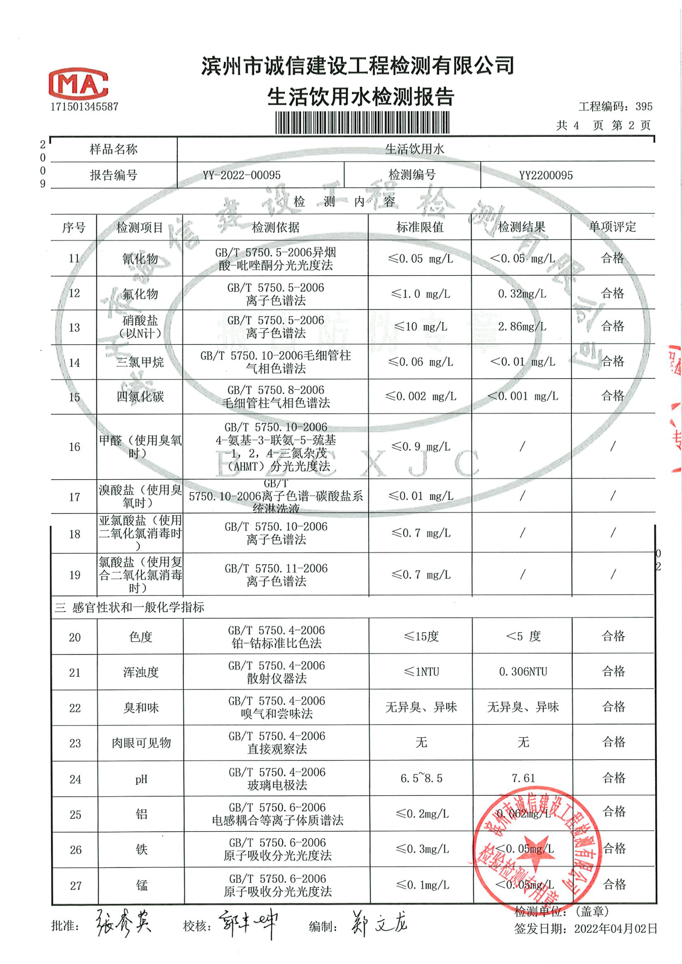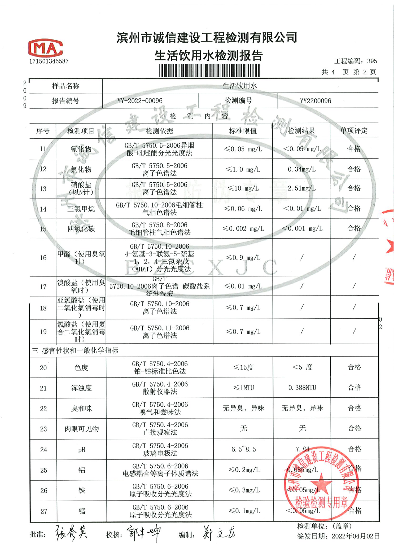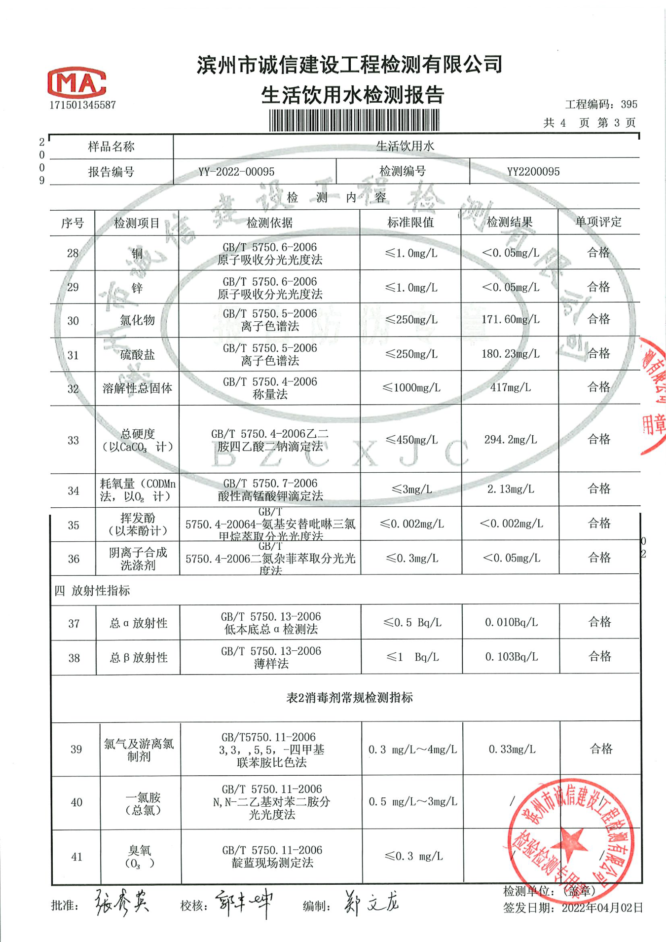 2022年第一季度出厂水42项检测报告
