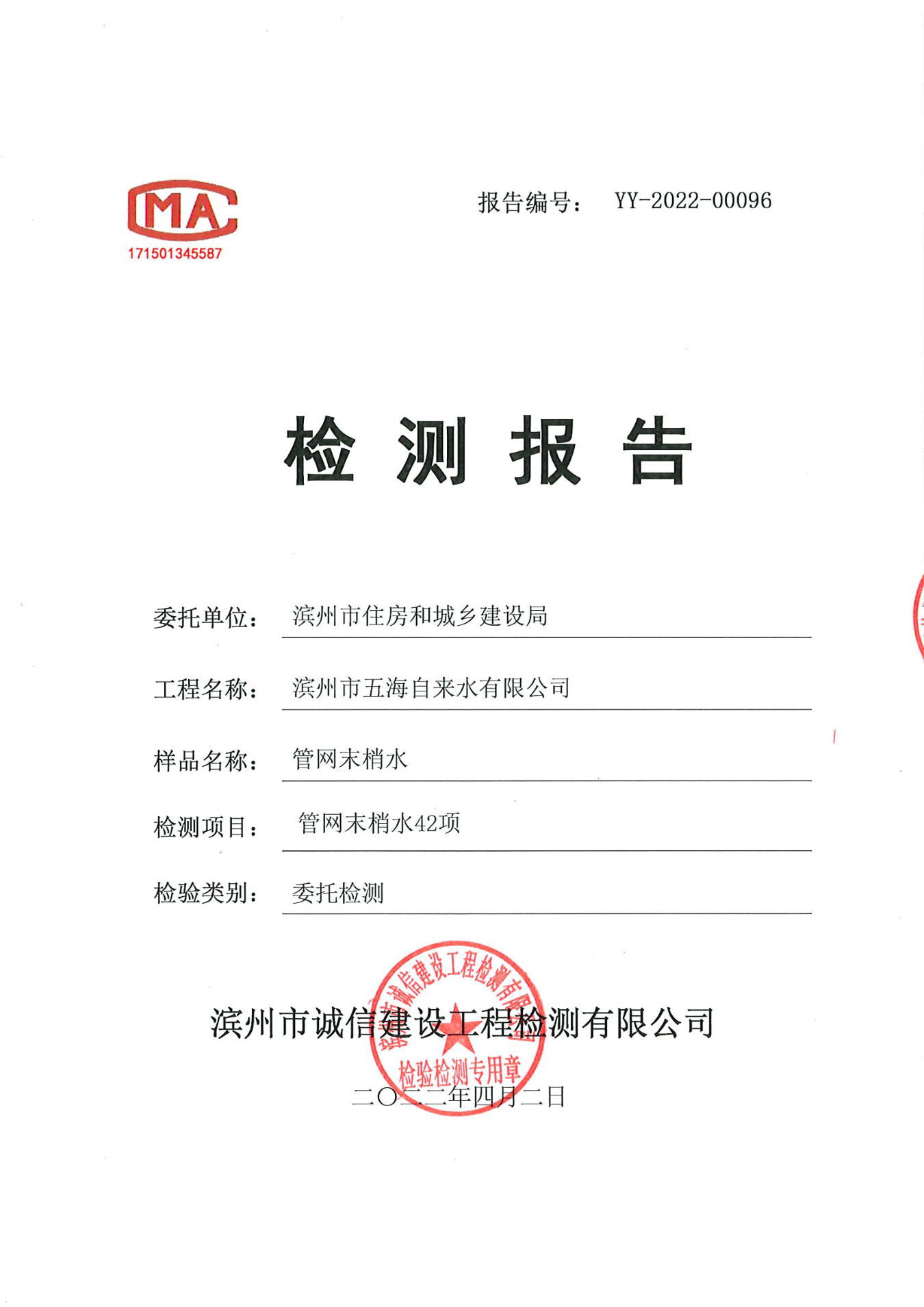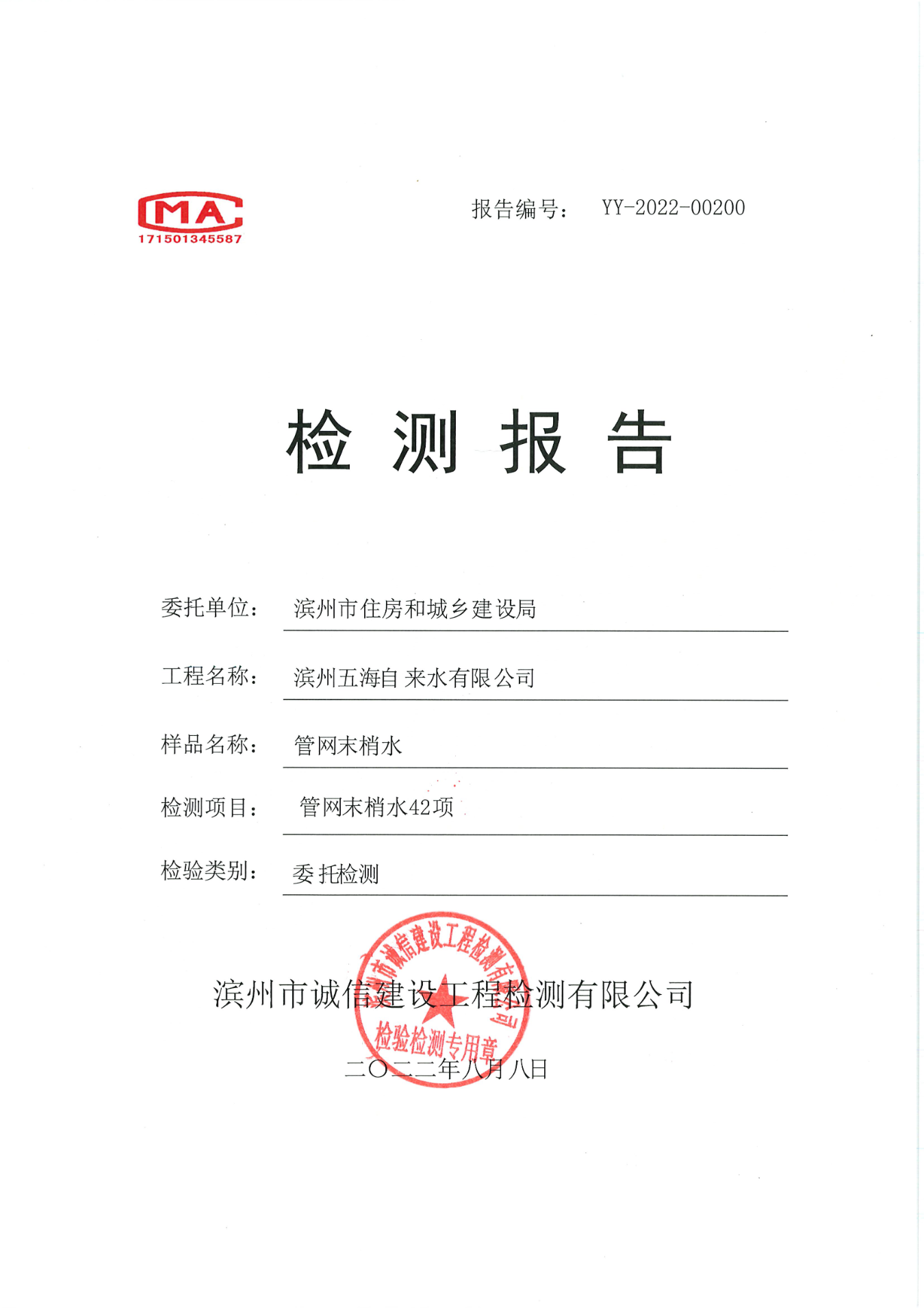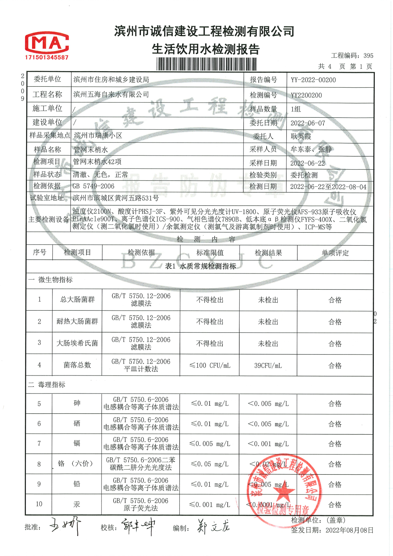 2022年第二季度管网末梢水42项检测报告