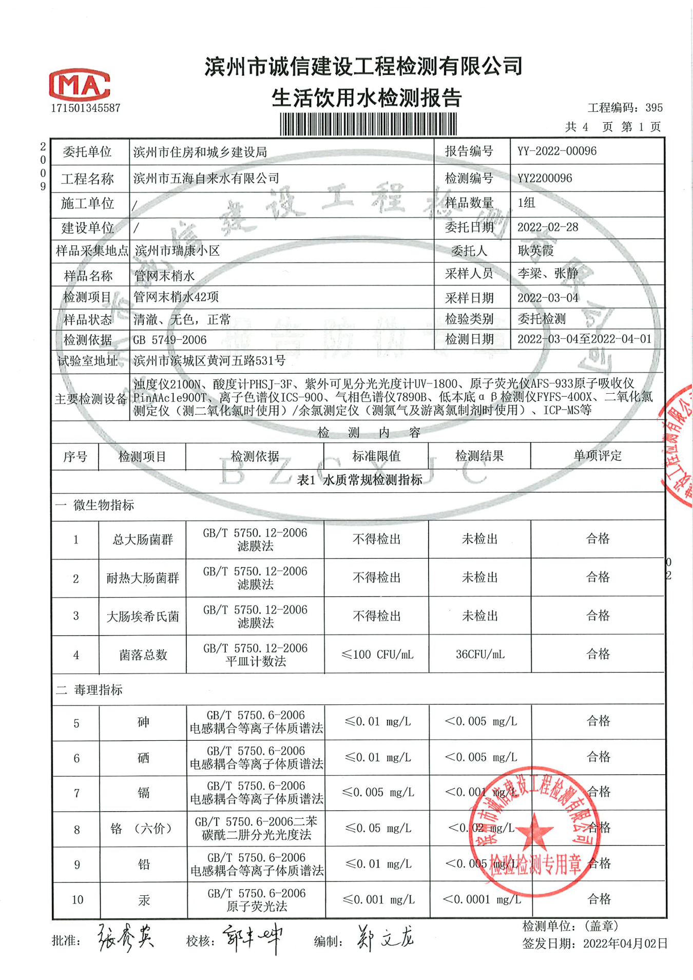 2022年第一季度管网末梢水42项检测报告