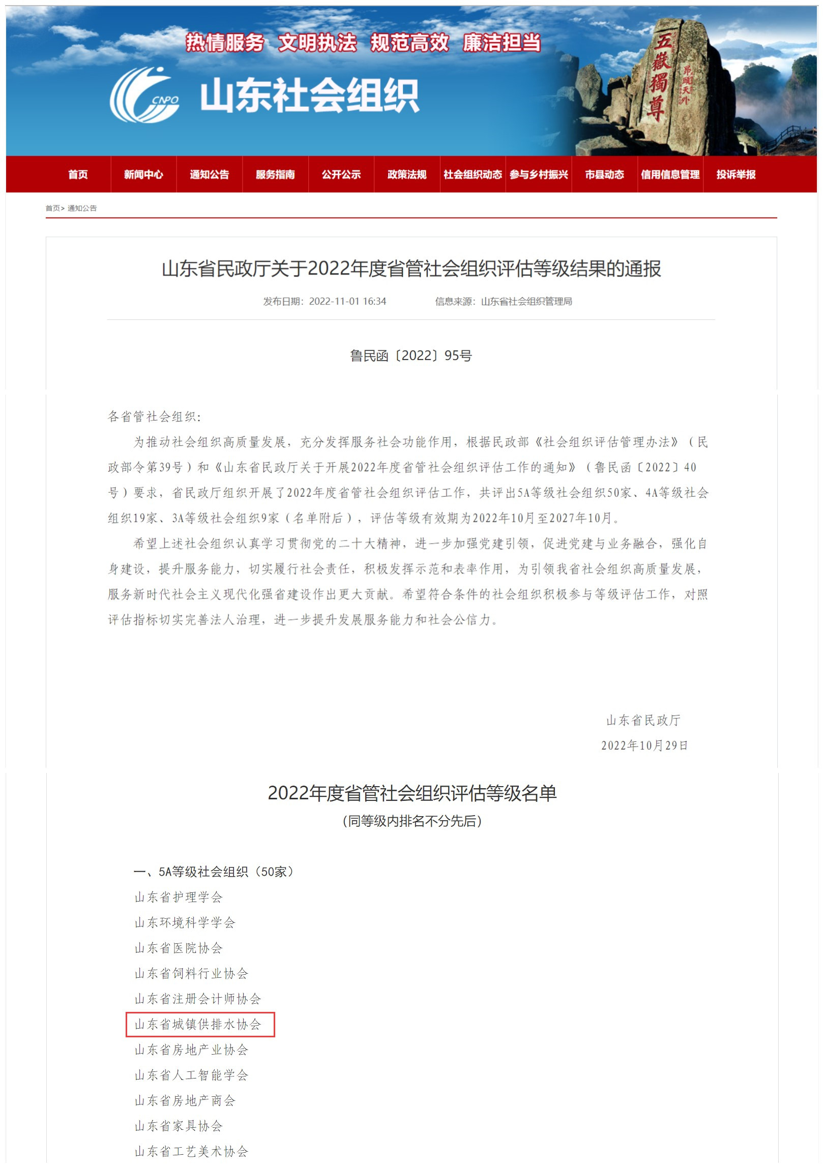 近日,省民政厅印发《关于2022年度省管社会组织评估等级结果的通报》(鲁民函〔2022〕95号),省水协获评5A等级社会组织,这是社会组织等级评估的最高等级,也是继今年协会党支部获评五星党支部、社会组织评星定级党建工作示范点后的又一殊荣。