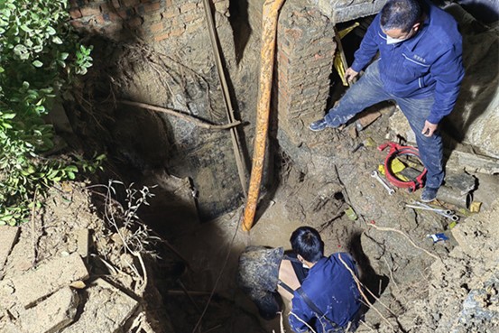 应急专班到达现场后了解到,自来水管线和弱电、污水等管道距离较近,在长时间的挤压下,接口处出现变形,导致管道破裂出现漏点,由于漏水点位置较深且下方空间狭小,给施工带来一定的难度。