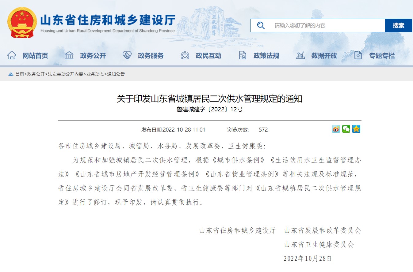 山东省住房和城乡建设厅 部门文件 关于印发山东省城镇居民二次供水管理规定的通知 (shandong.gov.cn)
