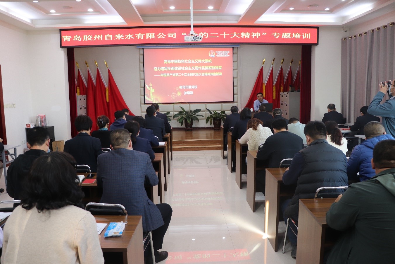 为深入贯彻落实青岛市委和水务集团党委关于学习贯彻党的二十大精神要求,进一步引导广大党员干部全面系统地理解掌握党的二十大精神深刻内涵与核心要义,11月24日下午,青岛胶州自来水有限公司党委邀请青岛市委党校中共党史党建与党性教育部副教授孙增德,在公司四楼会议室开展党的二十大精神专题培训。公司领导班子、专员级以上干部共40多人参加了培训。