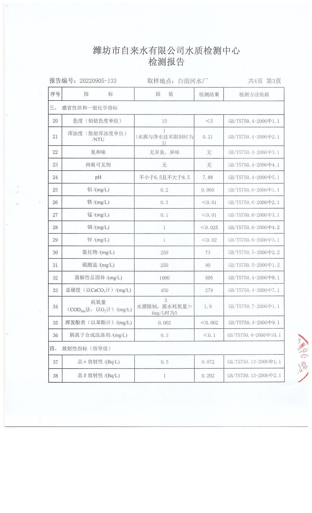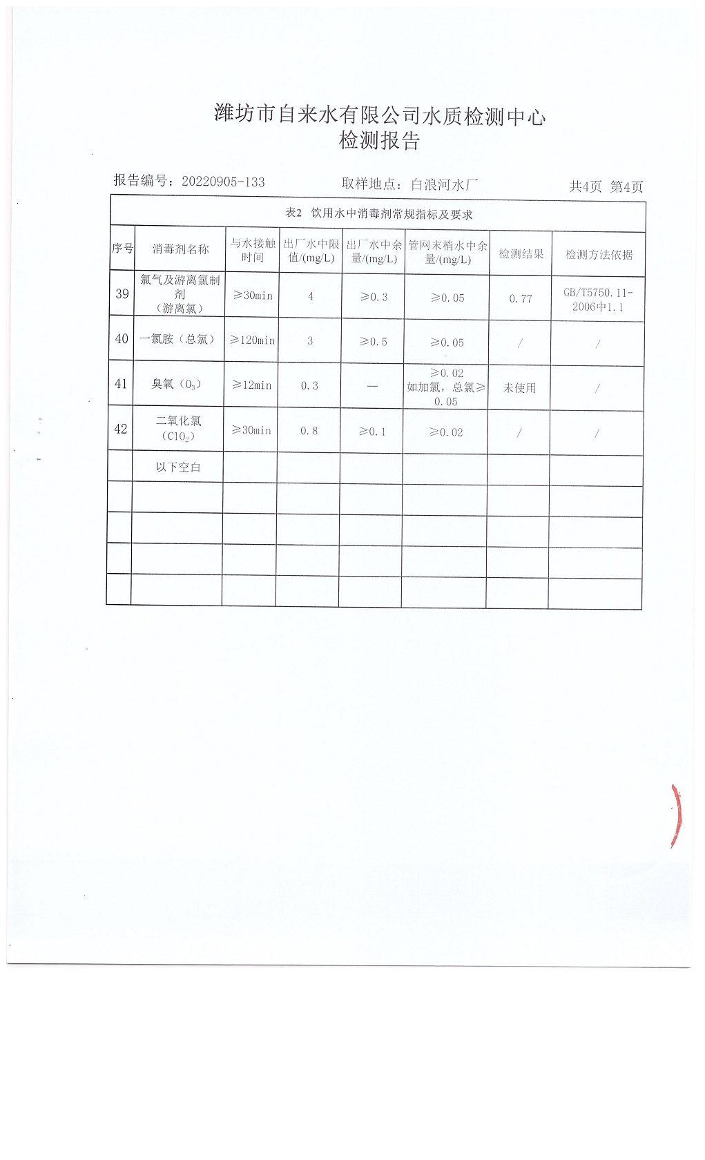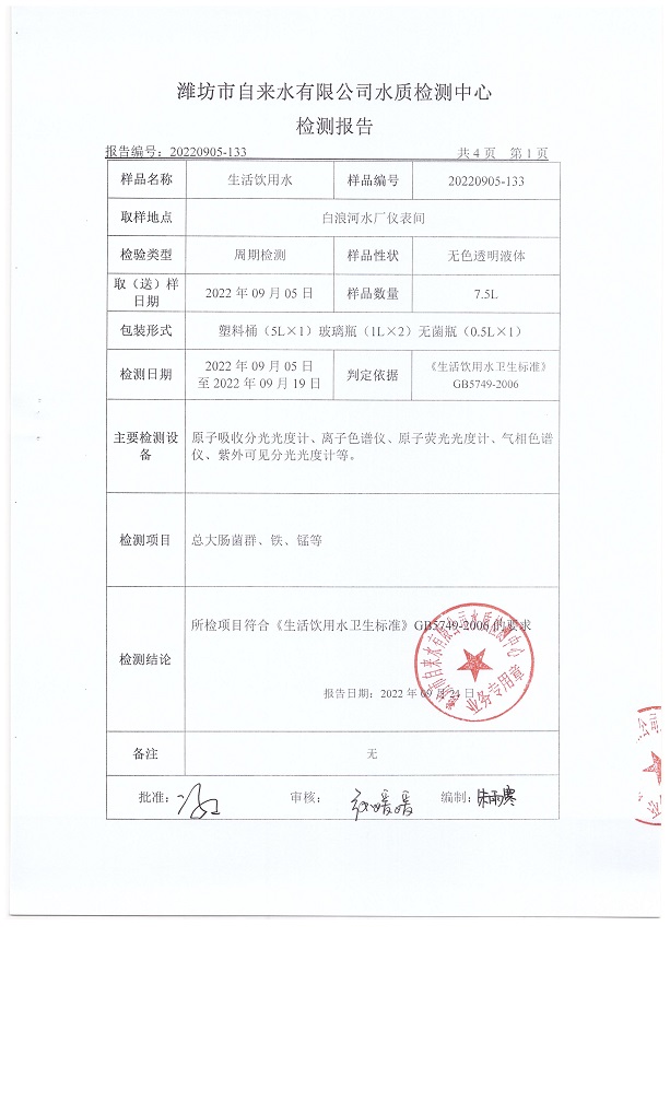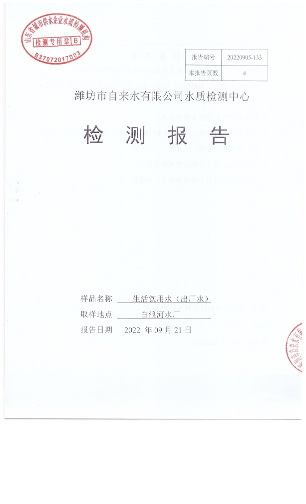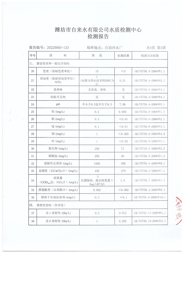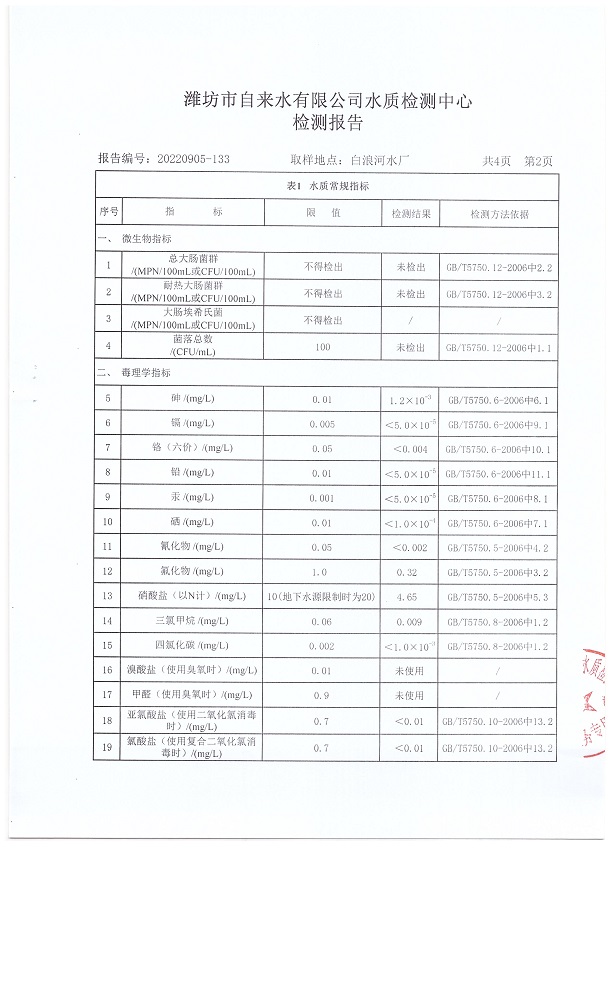 出厂水水质42项指标检测结果(2022年09月)