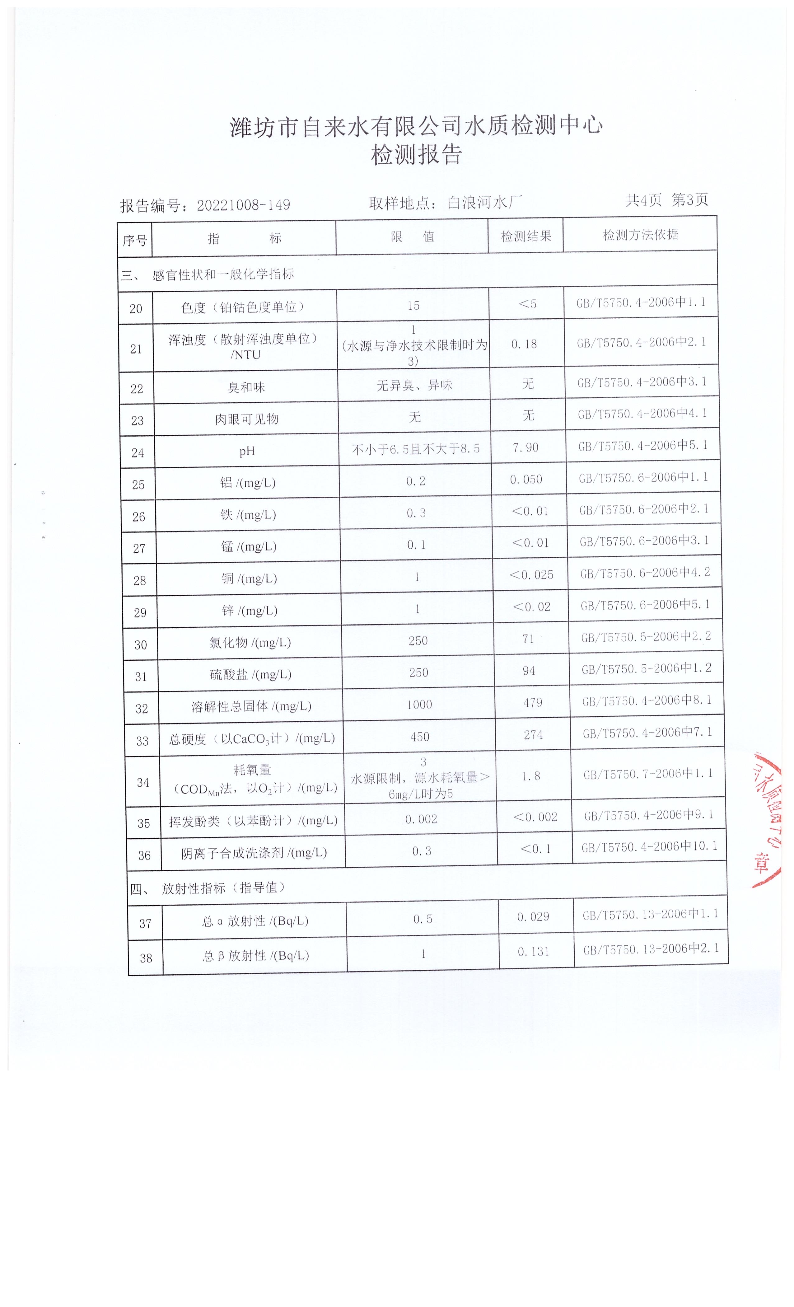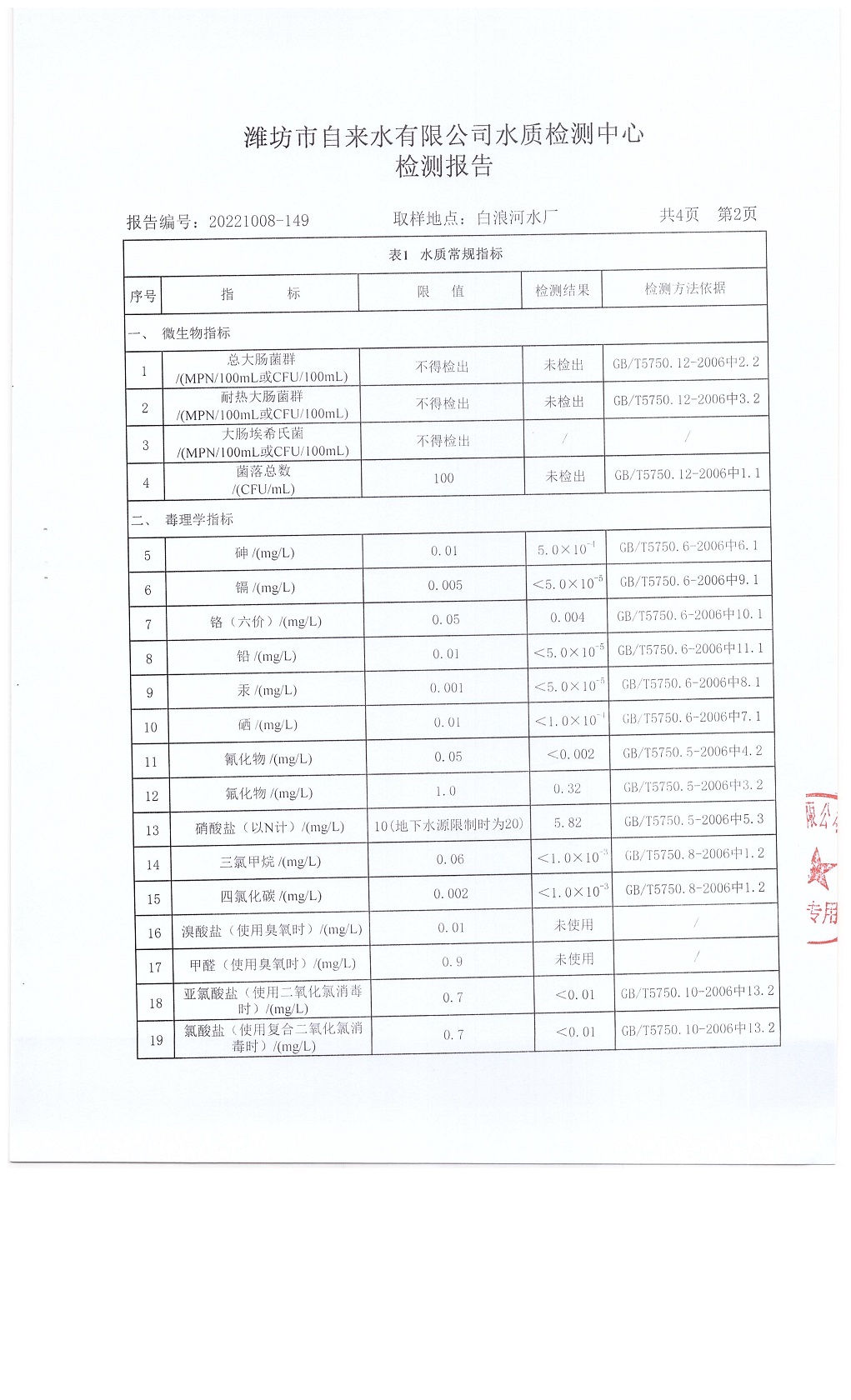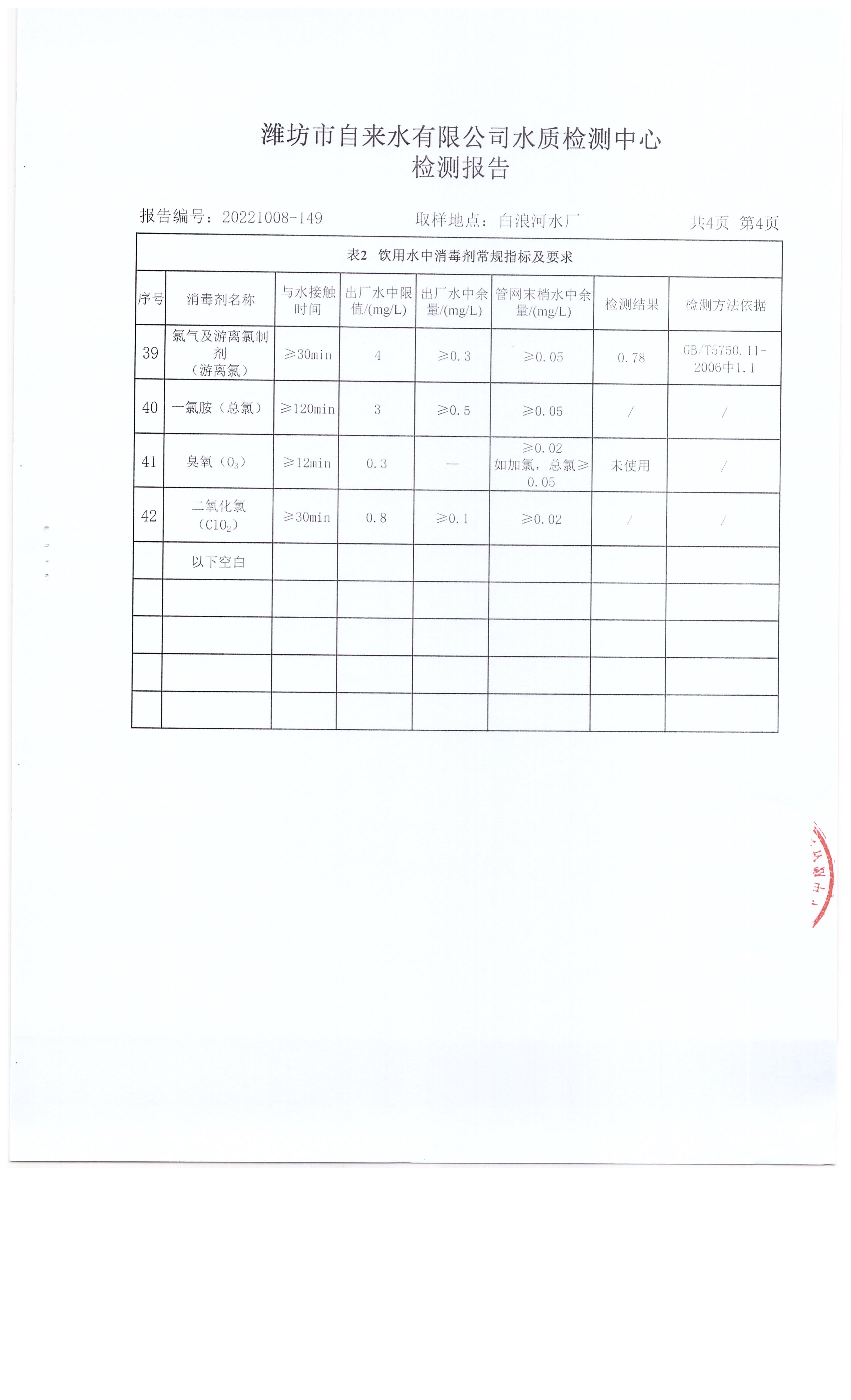 出厂水水质42项指标检测结果(2022年10月)