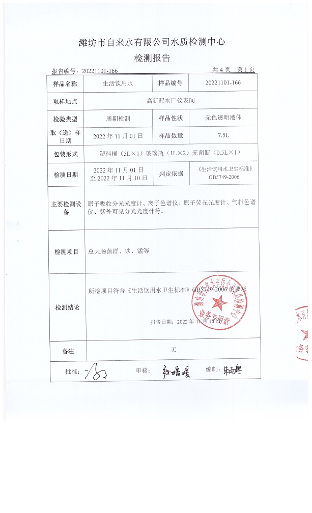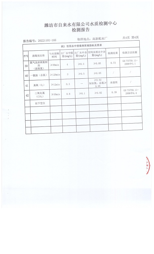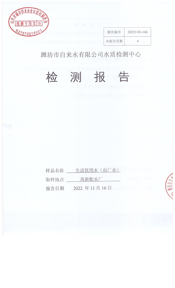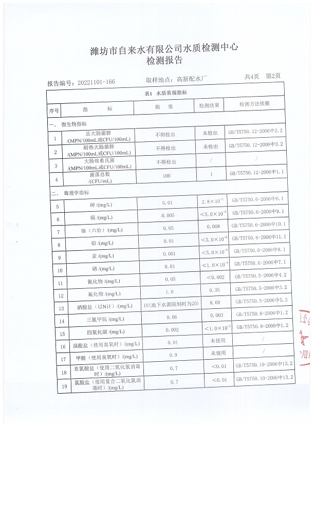 出厂水水质42项指标检测结果(2022年11月)