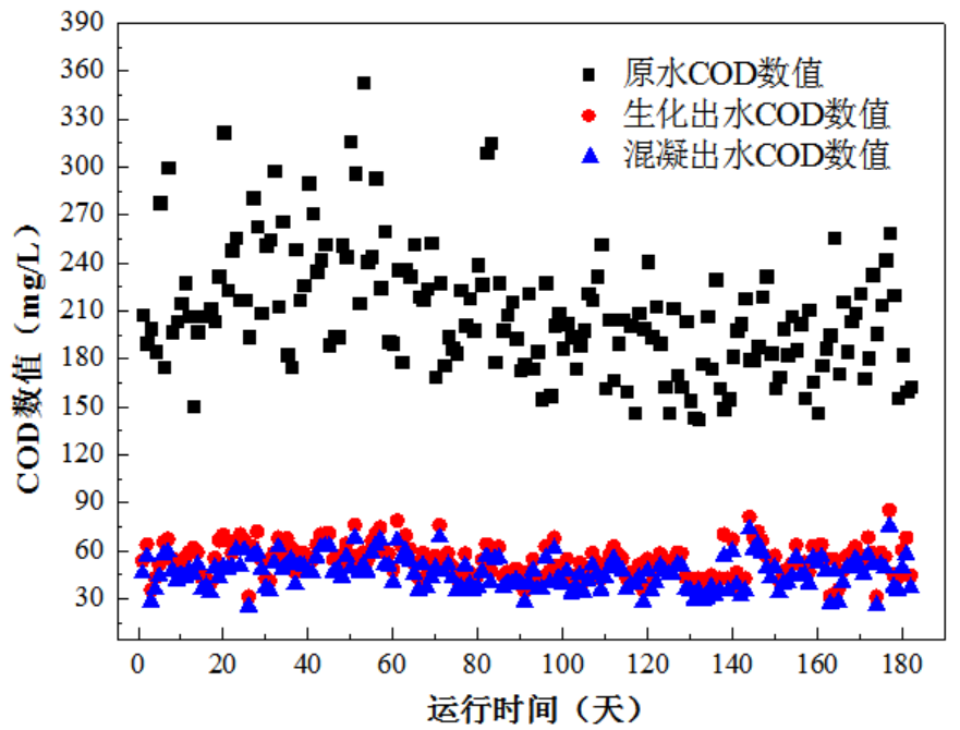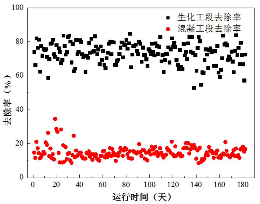 为探究各工段运行效果,自2019年10月始,对厂区进行180天的运行监测,监测期间厂区进水及混凝工段出水COD变化曲线、生化工段及混凝工段COD去除率如图2所示。