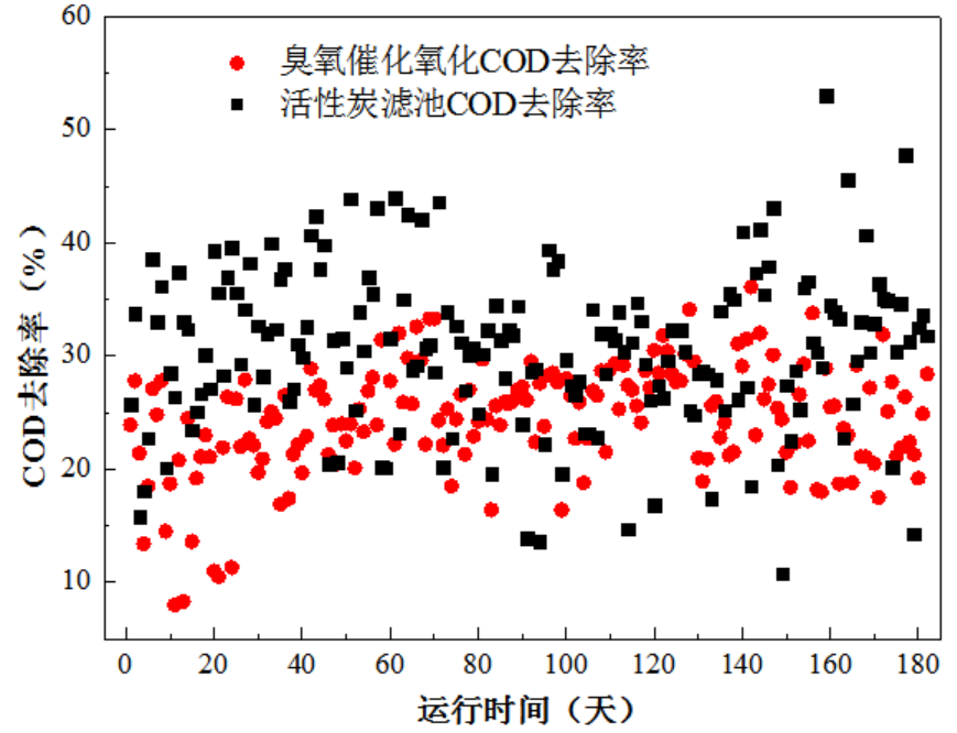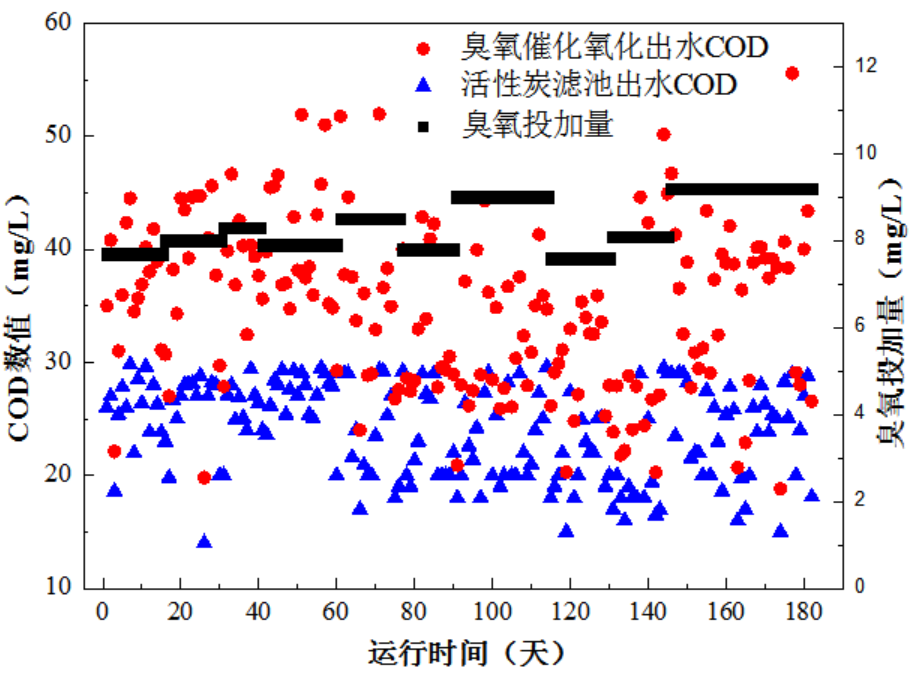 分析原因:臭氧催化氧化系统中,存在臭氧直接氧化与羟基自由基间接氧化两种氧化途径,系统具有较高的氧化电位(羟基自由基为2.80 V),一方面,可以直接将一部分有机物进行矿化,将发色基团通过氧化去除,因此COD均值从46 mg/L降低至35 mg/L,色度降至30倍以内;另一方面,可以完成难降解大分子有机物的开环、断链,将其分解成易于生物降解的小分子有机物,在后续活性炭滤池中,活性炭填料上生长有生物膜,可通过活性炭吸附-生物膜的降解作用,将生成的小分子有机物去除,同时将活性炭吸附性能恢复。
