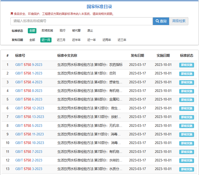 GB/T 5750-2023《生活饮用水标准检验方法》系列标准于2023年3月17日经国家市场监督管理总局(国家标准化管理委员会)批准发布,代替GB/T 5750-2006《生活饮用水标准检验方法》系列标准,自2023年10月1日起实施。
