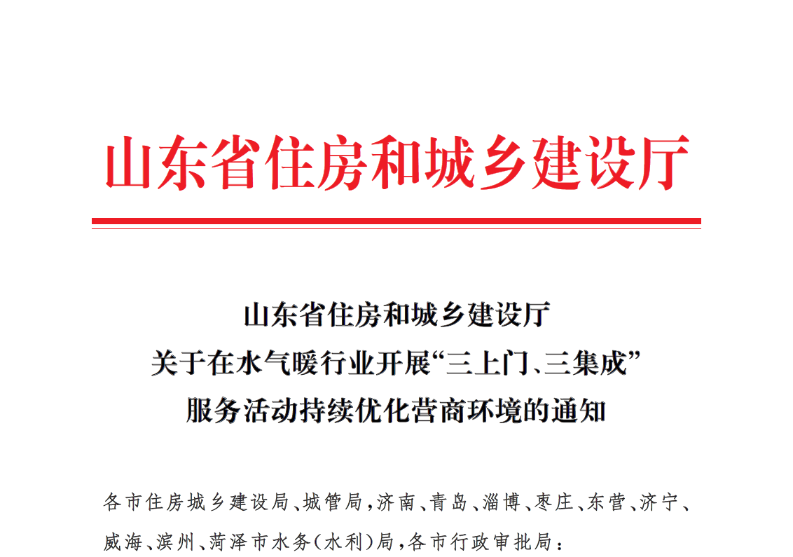 为贯彻落实省委、省政府关于优化营商环境创新提升的部署要求,积极配合省纪委监委护航优化营商环境专项行动,提高城市市政公用事业服务水平,近日,省住房城乡建设厅印发《山东省住房和城乡建设厅关于在水气暖行业开展“三上门、三集成”服务活动持续优化营商环境的通知》(以下简称《通知》)。《通知》提出,立足城市供水、供气、供热等市政公用行业实际,坚持以用户为中心,深入推行“一线工作法”,多听取中小微企业呼声,多从市场主体角度查找问题,广泛开展上门解读政策、上门宣讲知识、上门解决问题等“三上门”活动,推动系统平台、服务场所和管道改造等“三集成”实施,通过多渠道沟通、直达式互动、全方位服务,不断提升用户获得感、满意度。