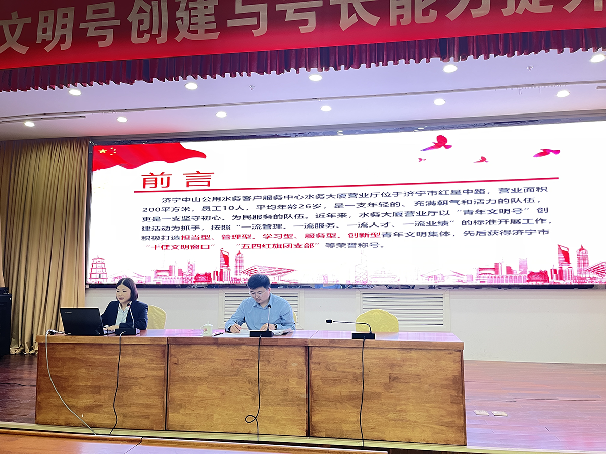 济宁中山公用水务有限公司客户服务中心水务大厦营业厅作为山东省“青年文明号”,号长以“以如水青春 守服务初心”为主题,向与会人员介绍了水务大厦营业厅“青年文明号”创建以来开展的各项活动和取得的突出成效,分享了营业厅以“健全一流管理、完善一流服务、打造一流人才、拼搏一流业绩”的标准,打造“担当型、管理型、学习型、服务型、创新型”青年文明集体的先进做法。