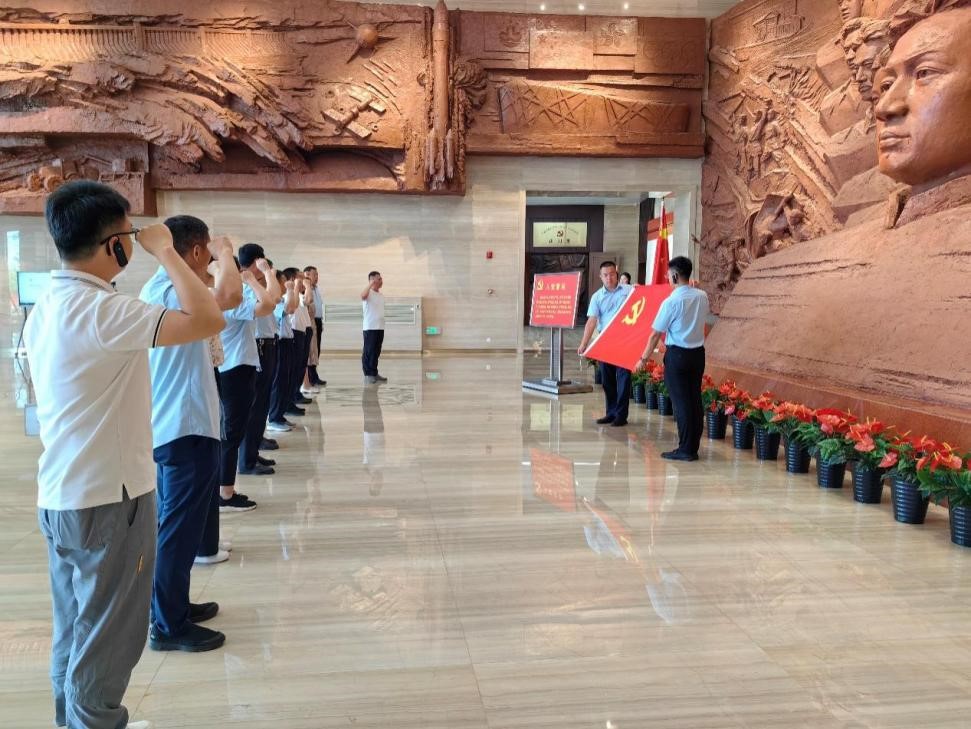 在庄严肃穆的“铁肩”雕塑群像前,全体党员握起拳头,在鲜红的党旗下重温入党誓词,追溯初心使命,铿锵有力的誓言充分表达了对党的无限忠诚和崇高敬意。