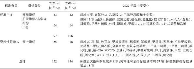 2022年3月15日,《生活饮用水卫生标准》(GB 5749—2022)(以下简称“新标准”)由国家市场监督管理总局和国家标准化管理委员会联合发布,由国家卫生健康委员会提出并归口,于2023年4月1日开始实施 。 作为保护人群饮水安全及健康的法定卫生标准,水质指标及其限值是本标准的核心内容,结合我国实际情况科学、合理地筛选水质指标,对于标准的有效贯彻实施至关重要 。 新标准中标准正文包含水质指标97项,资料性附录中包含水质指标55项,与2006年版《生活饮用水卫生标准》相比,指标数量均有变化。 本文将以两版标准中指标变化情况为切入点,系统介绍新标准制定过程中指标遴选的原则和依据,同时对饮用水标准在指标遴选方面未来的发展方向和关注点提出思考意见。