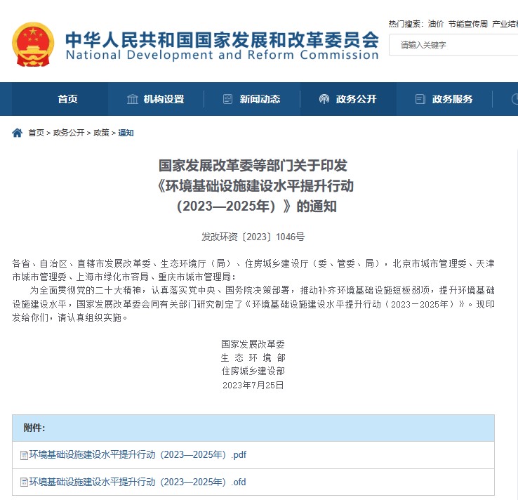 近日,国家发展改革委、生态环境部、住房城乡建设部等部门印发《环境基础设施建设水平提升行动(2023—2025年)》(发改环资〔2023〕1046号,以下简称《行动方案》),部署推动补齐环境基础设施短板弱项,全面提升环境基础设施建设水平。