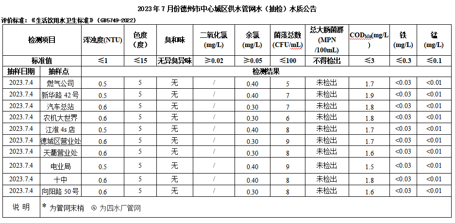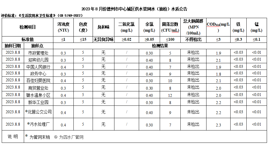 2023年9月份德州市中心城区供水管网水(抽检)水质公告