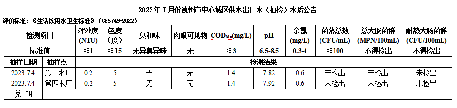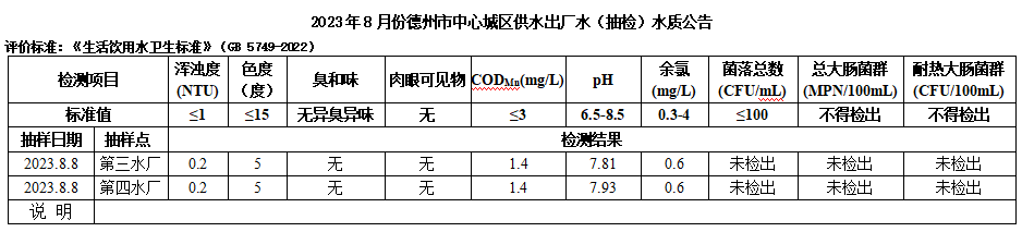 2023年9月份德州市中心城区供水出厂水(抽检)水质公告