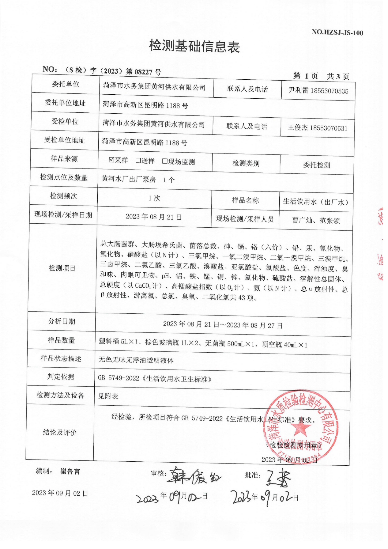 2023年8月出厂水检测报告