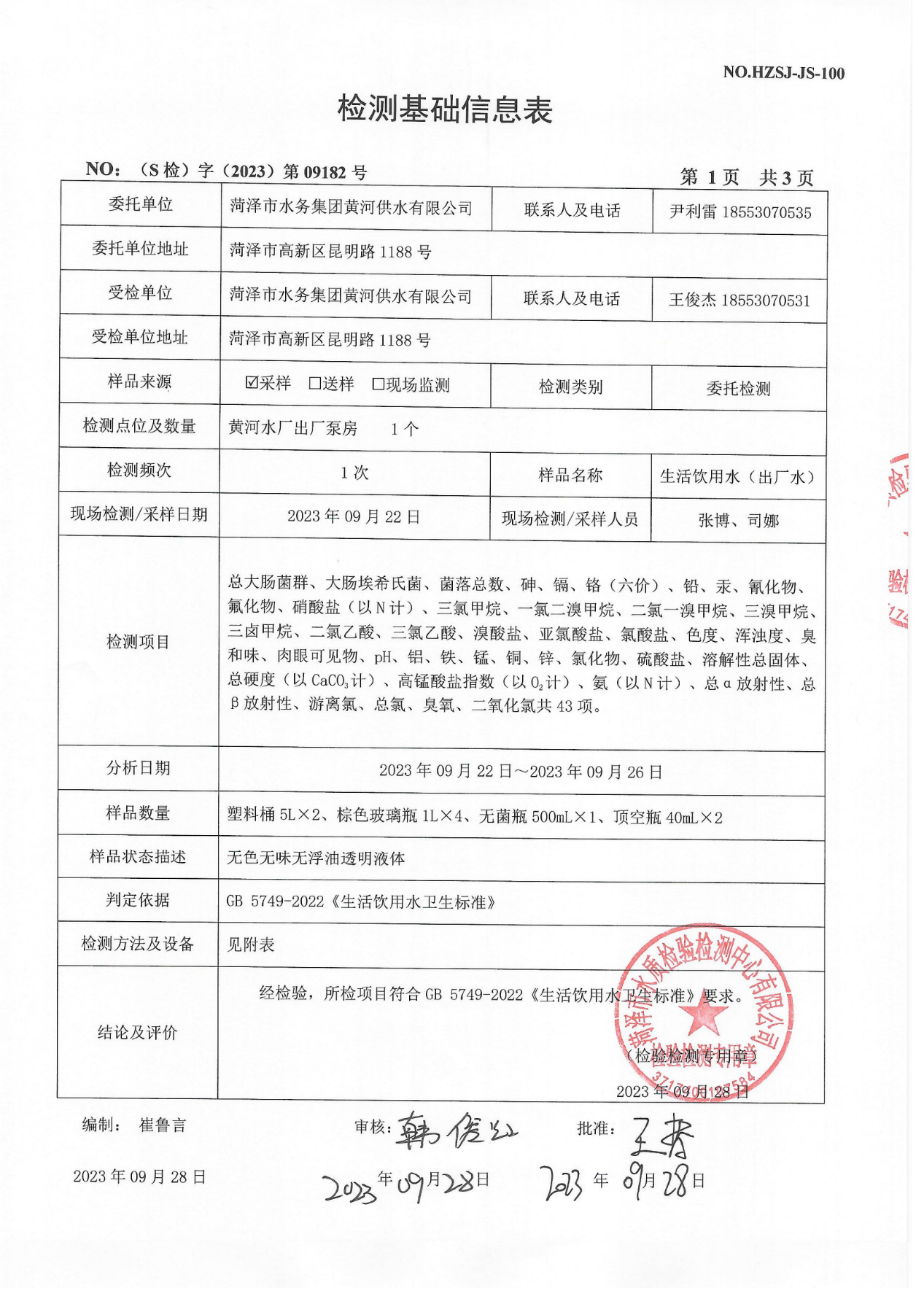 2023年9月出厂水检测报告