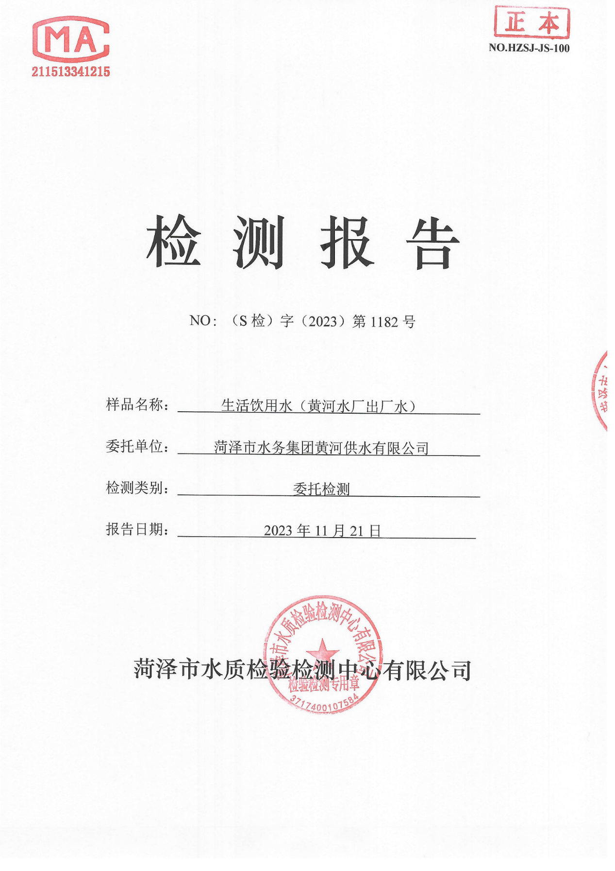2023年11月出厂水检测报告