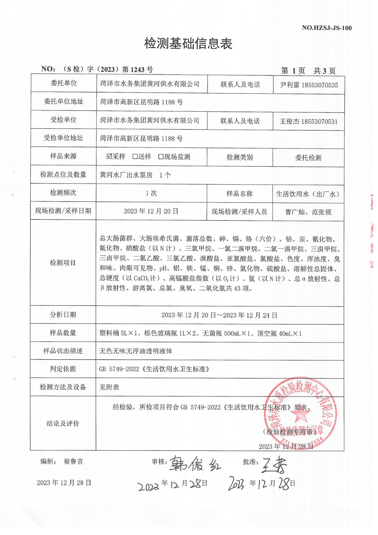 2023年12月出厂水检测报告