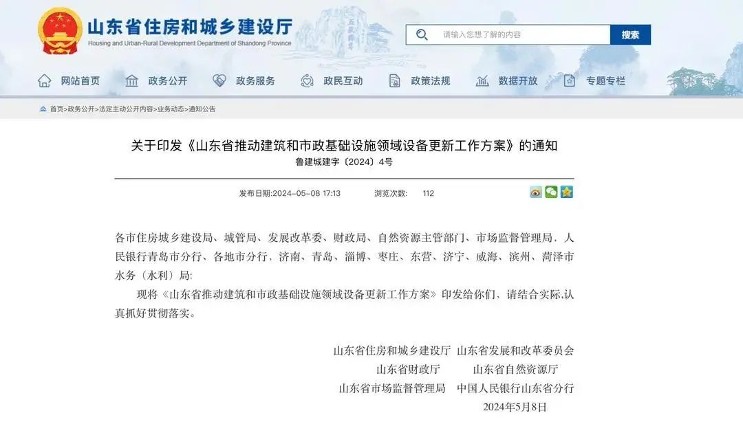 5月8日,省住房城乡建设厅、省发展改革委、省财政厅、省自然资源厅、省市场监督管理局、中国人民银行山东省分行6部门联合印发《山东省推动建筑和市政基础设施领域设备更新工作方案》(后简称《方案》)。《方案》明确,今年全省加装既有住宅电梯1500部,更新(改造、大修)住宅老旧电梯2000部以上,2027年全省建筑和市政基础设施领域设备投资规模较2023年增长28%以上。