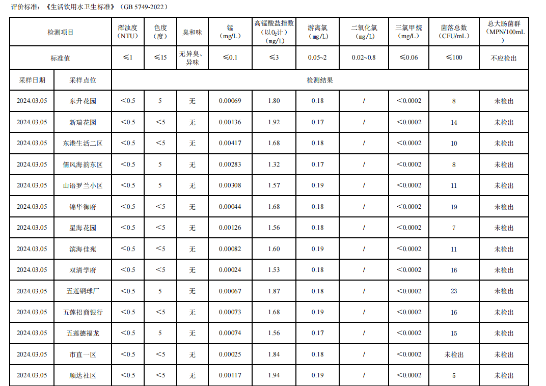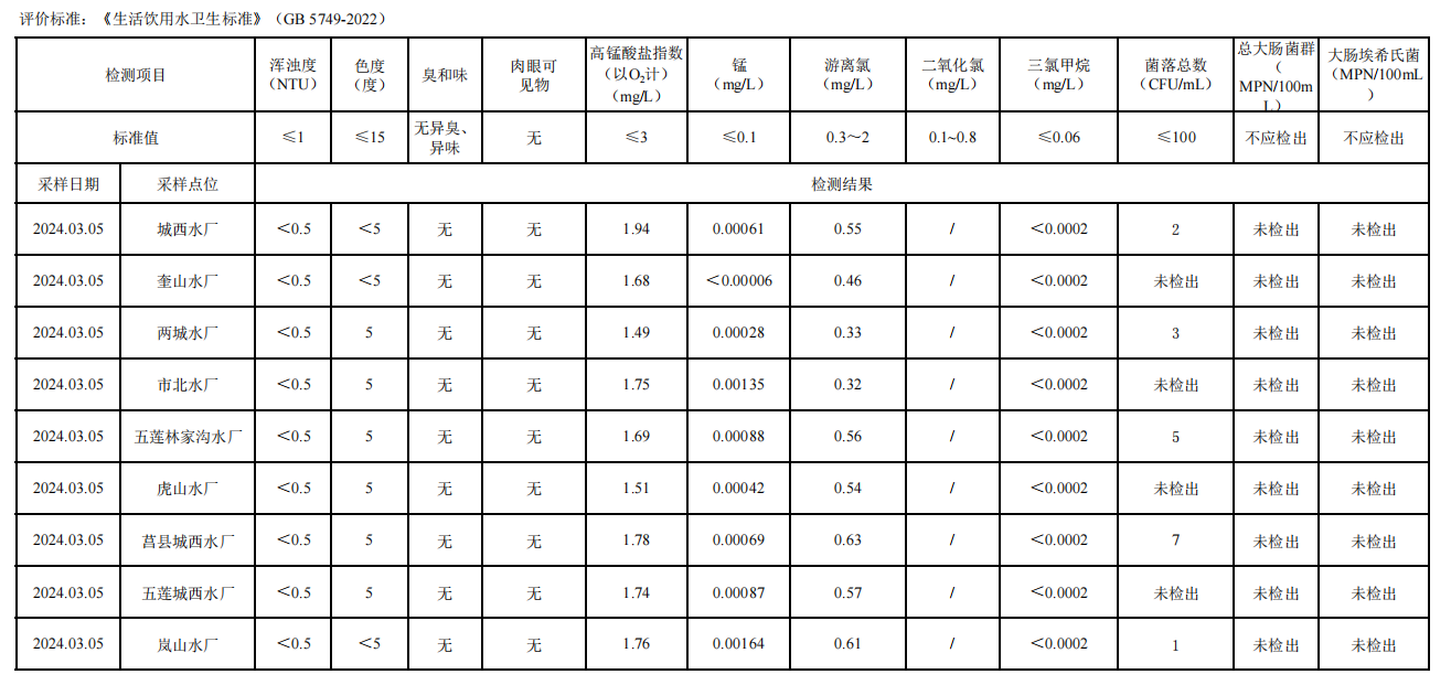 日照市第一季度出厂水水质检测报告