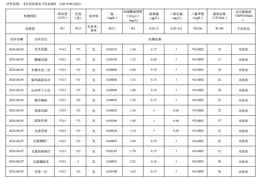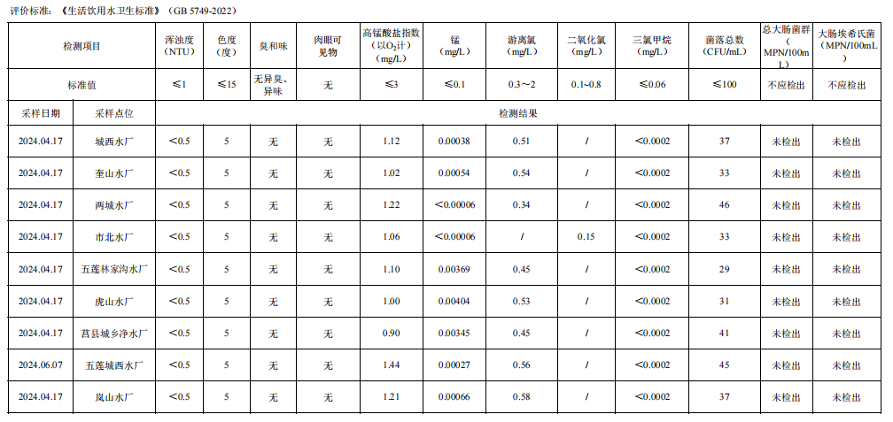 日照市第二季度出厂水水质检测报告