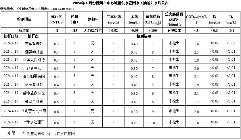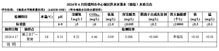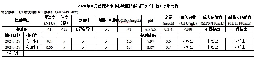 2024.3.4 | 德城区营业处 | 0.5 | 5 | 无 | / | 0.50 | 5 | 未检出 | 1.7 | <0.03 | <0.01 |