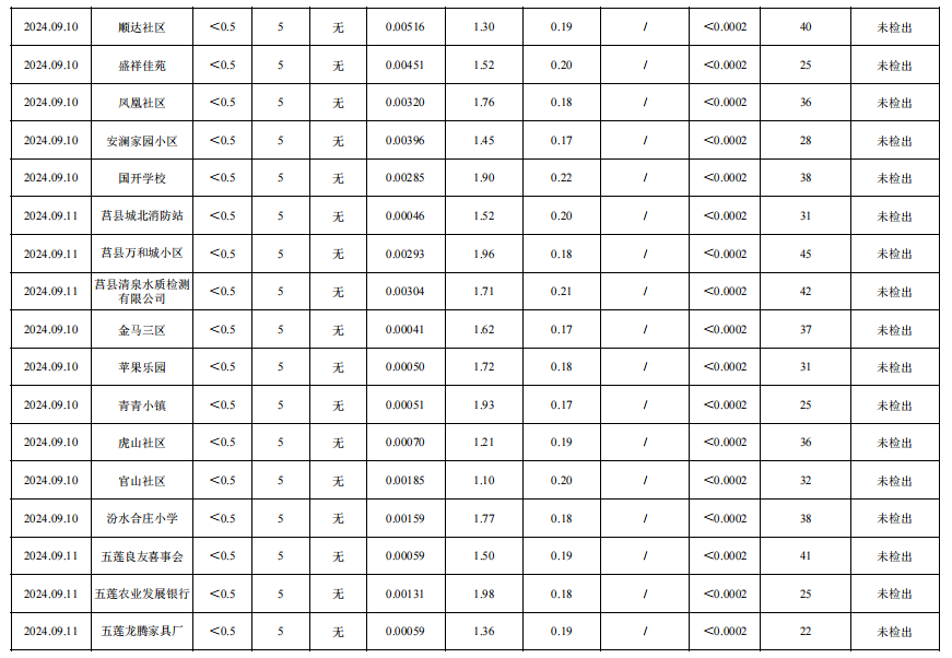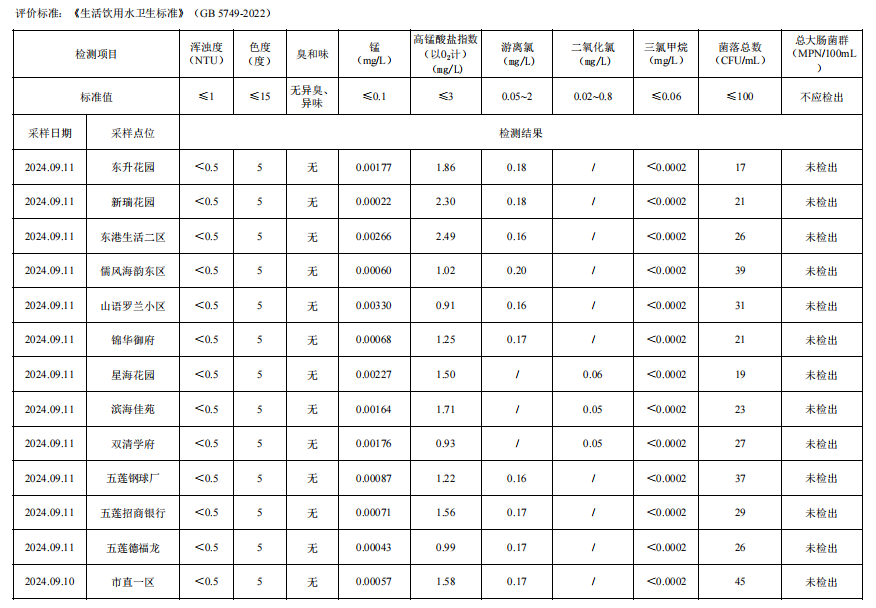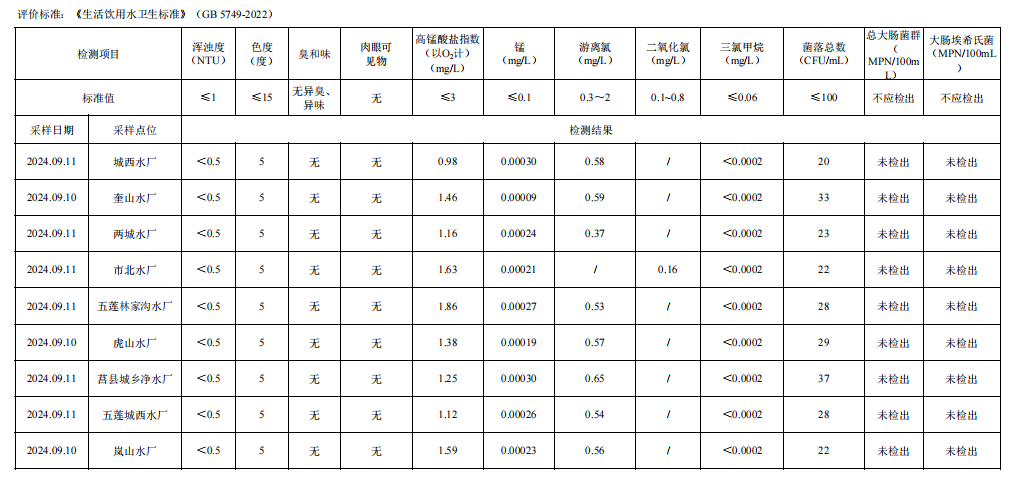 2024年三季度日照市城市供水管网水(抽检)水质公告
