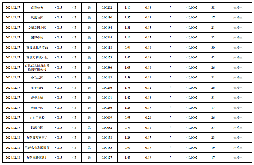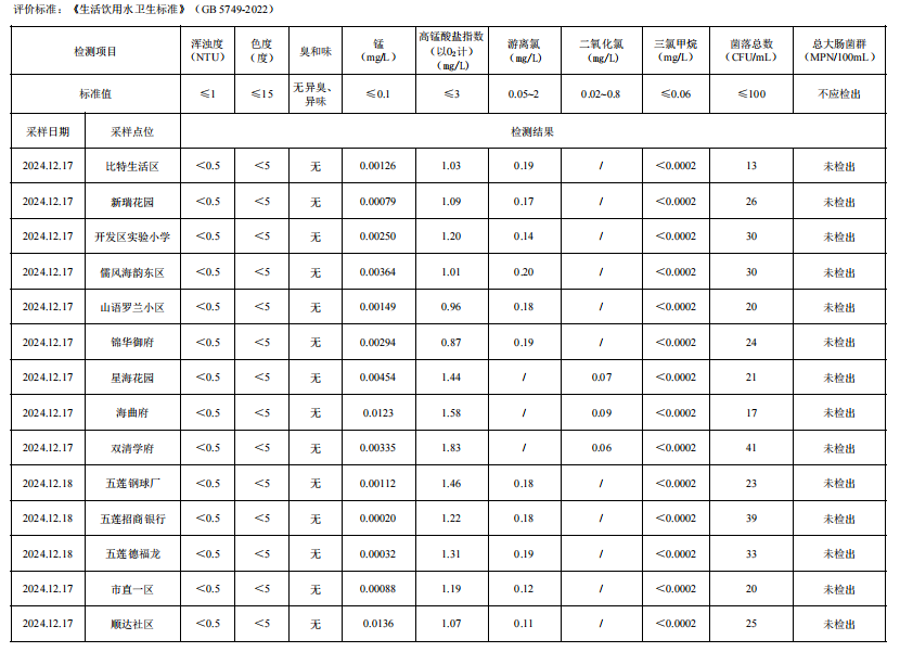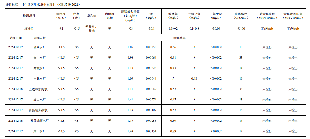 2024年四季度日照市城市供水管网水(抽检)水质公告