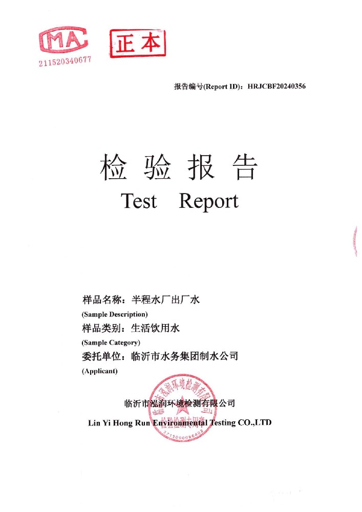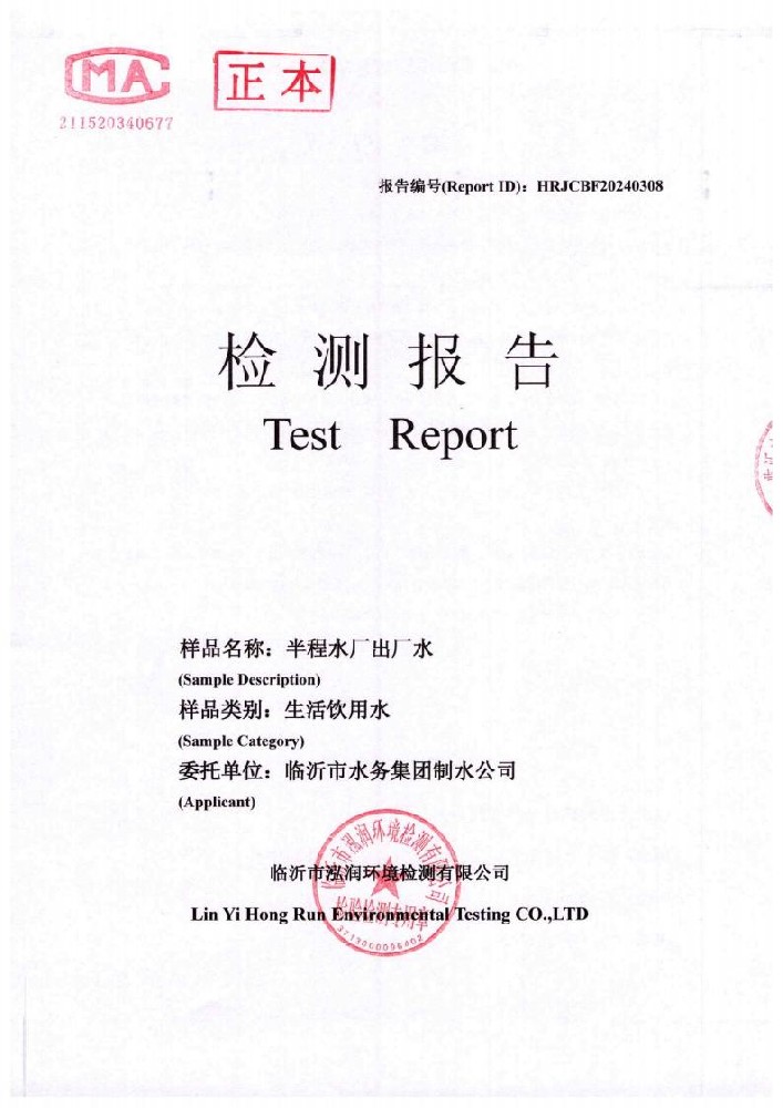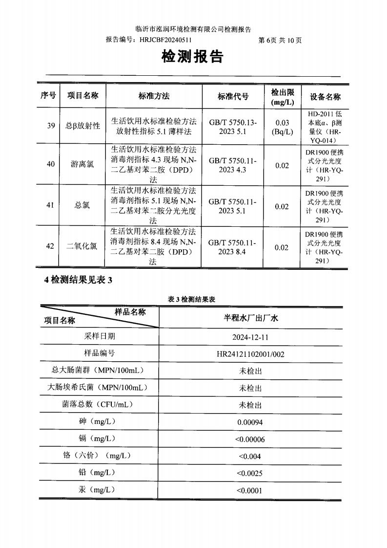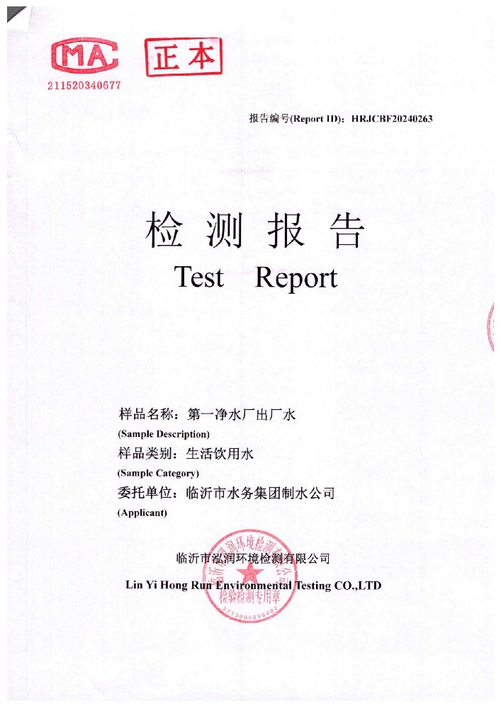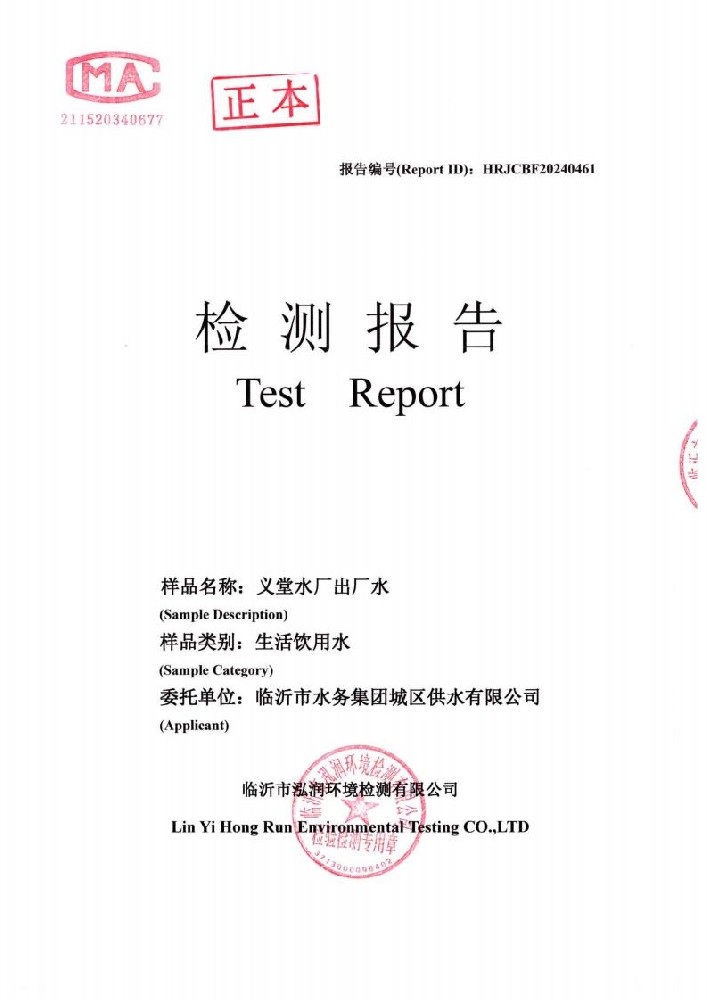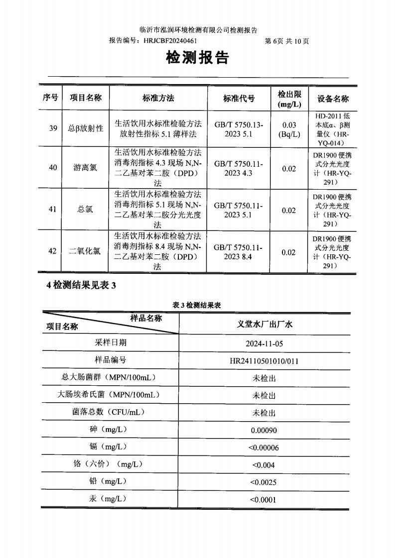 2024年10月出厂水水质检测报告(临沂市水务集团)