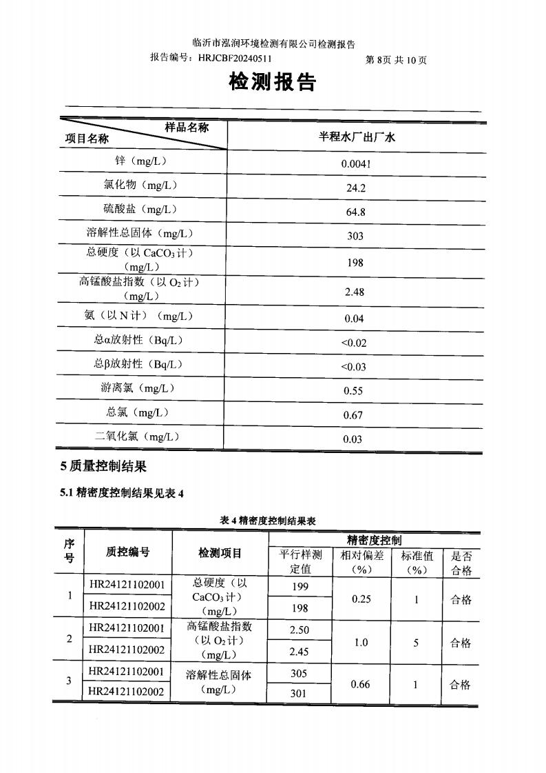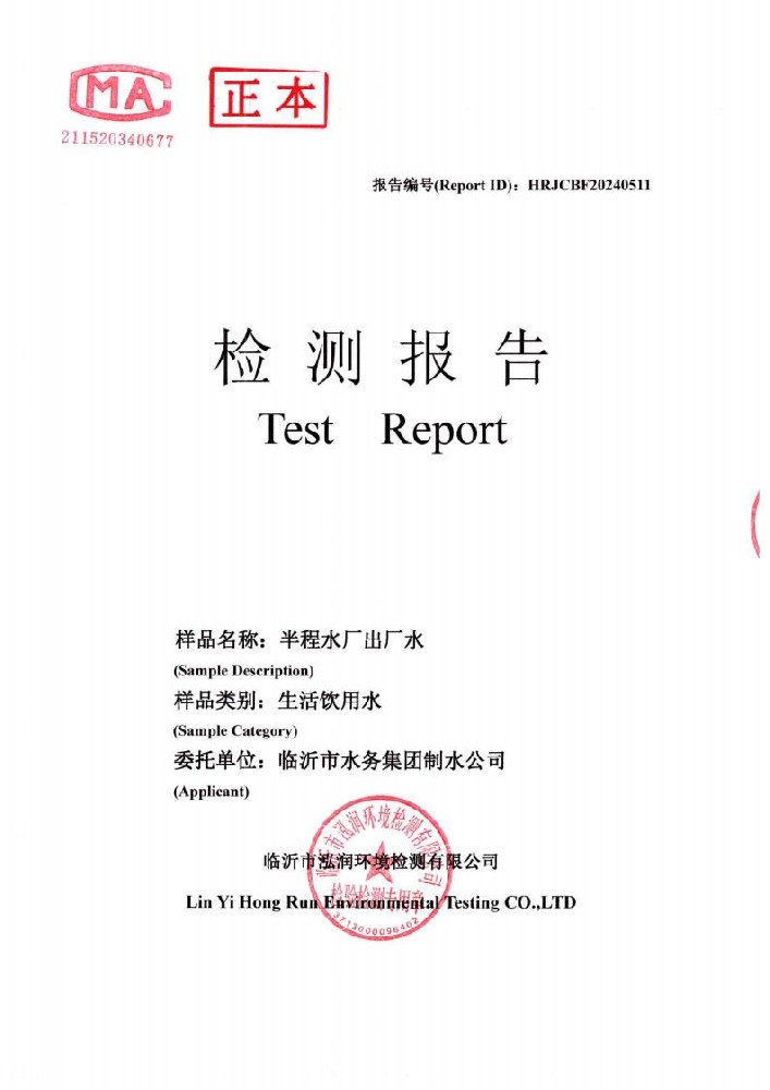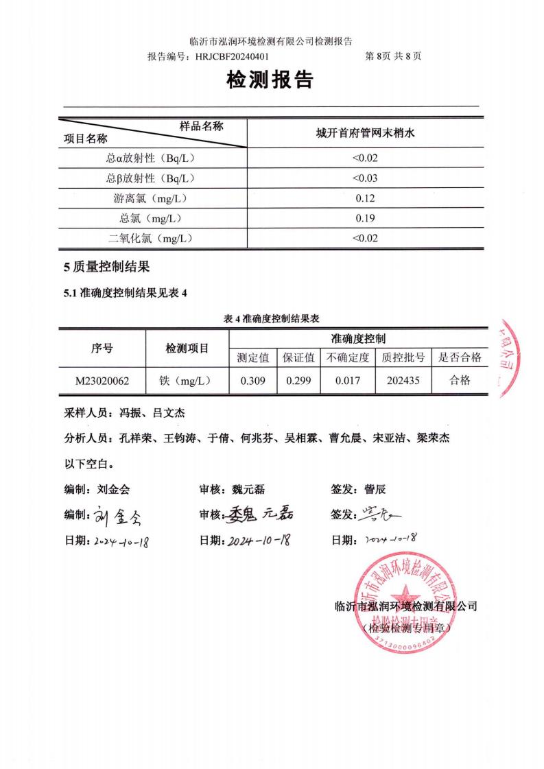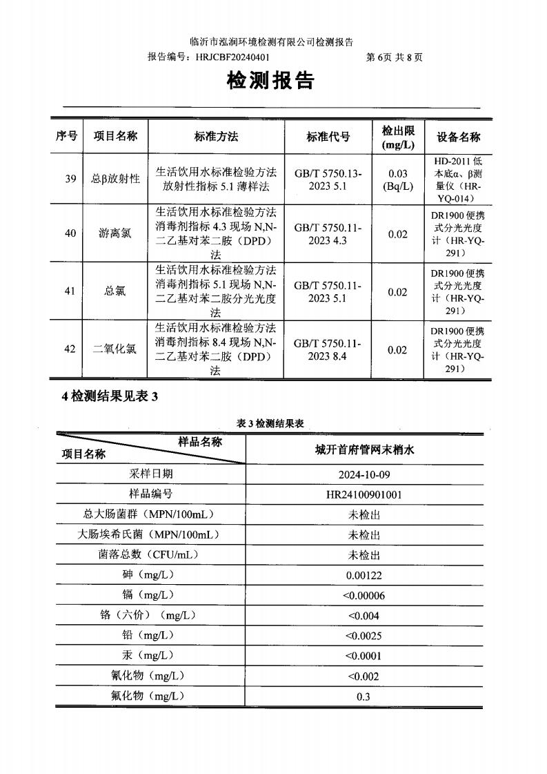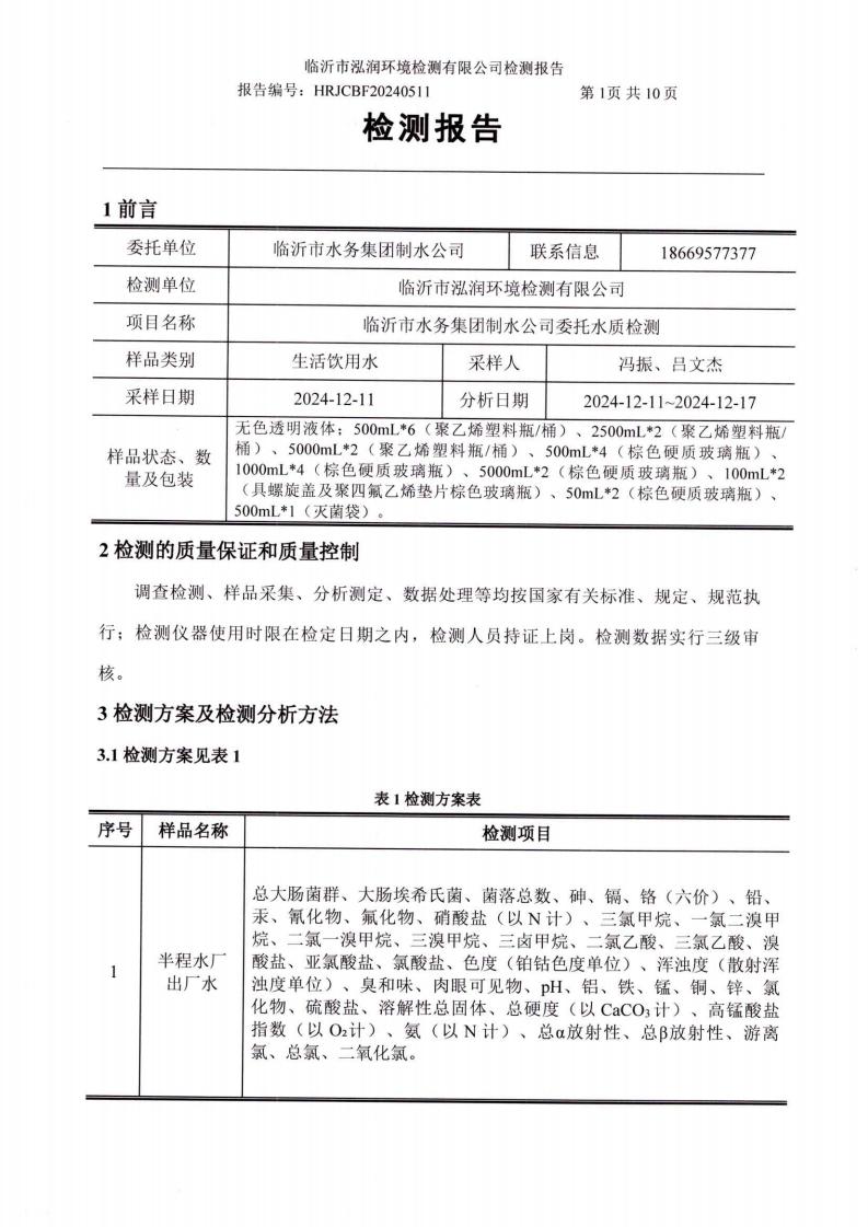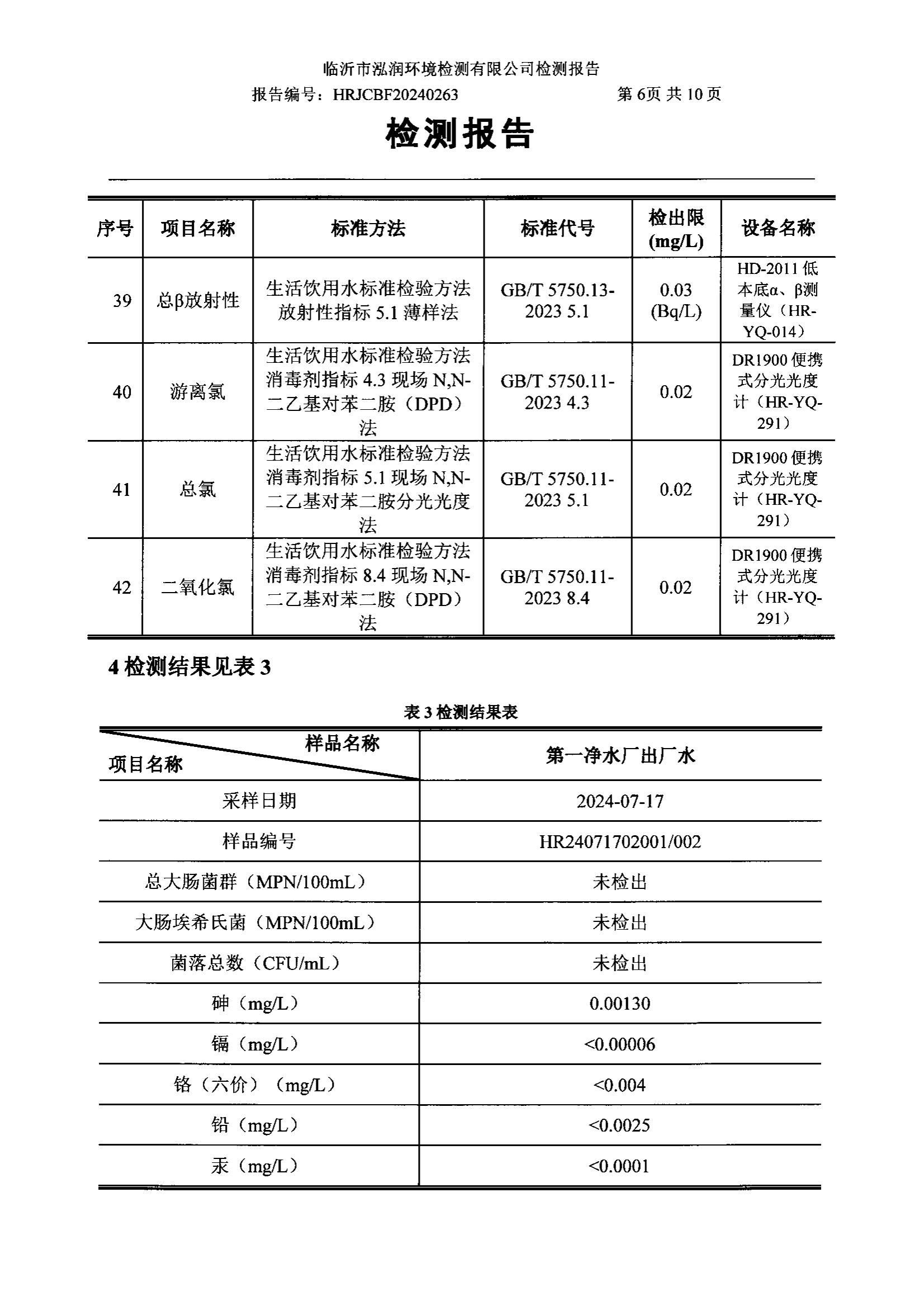2024年10月出厂水水质检测报告(临沂市水务集团)