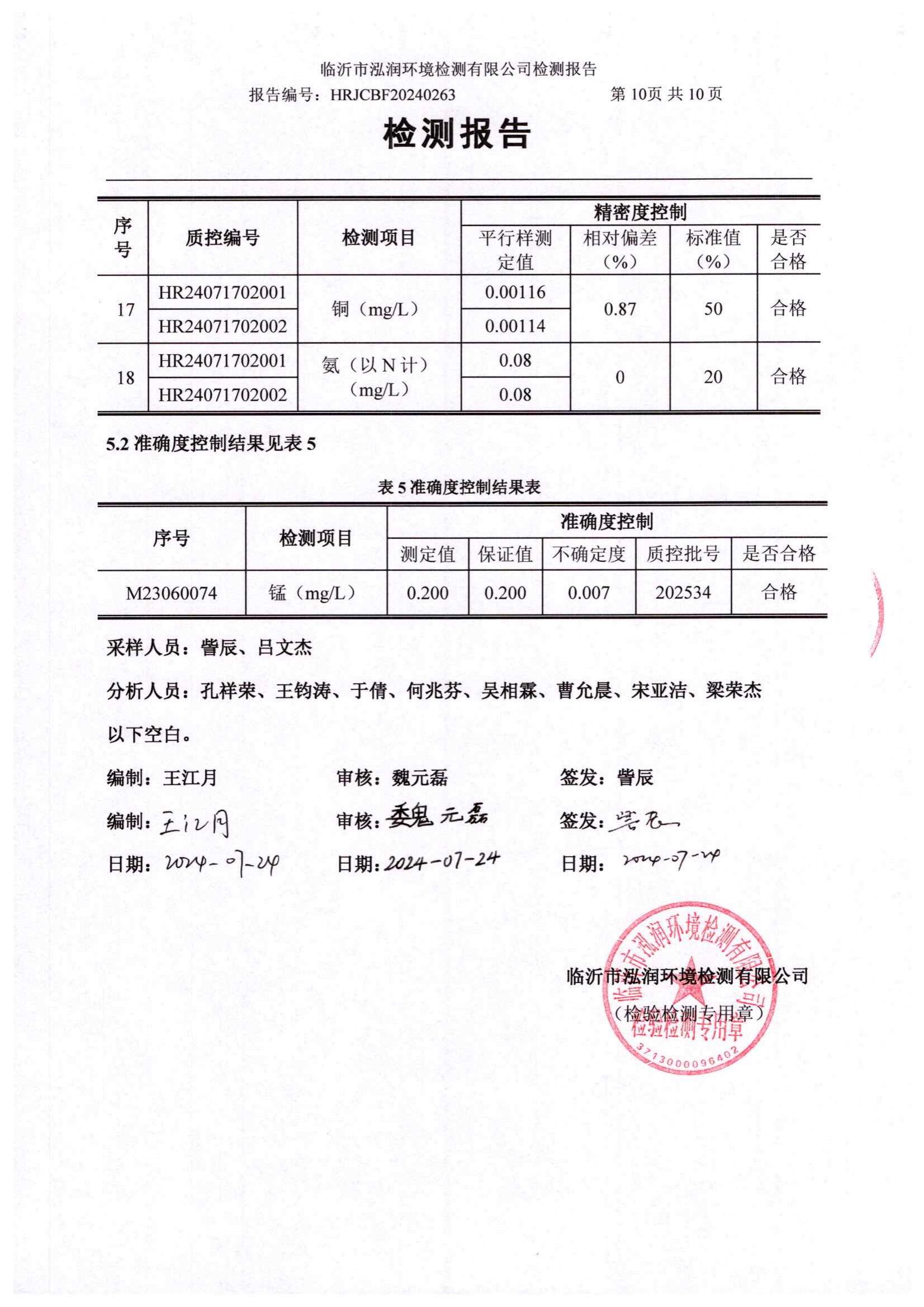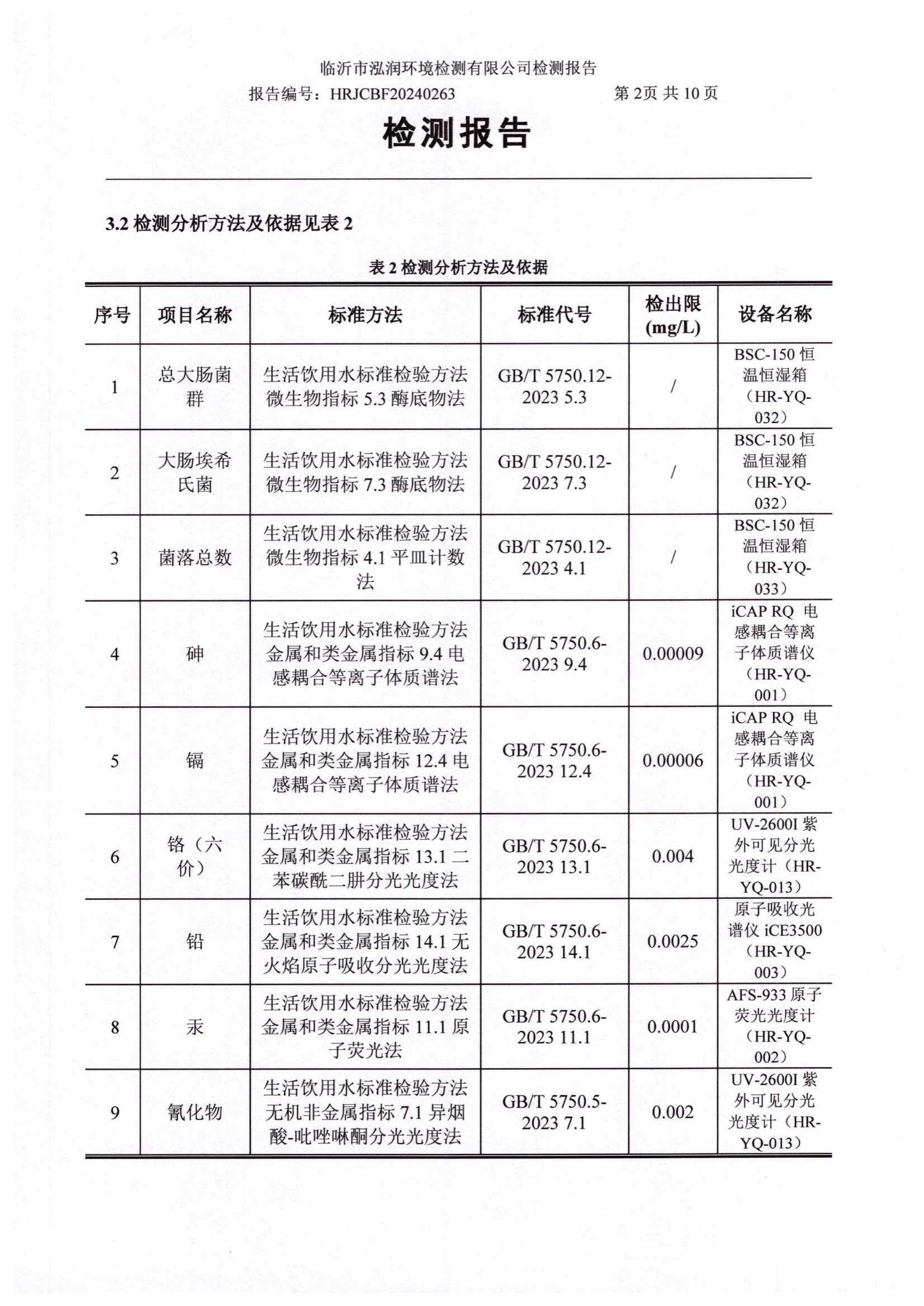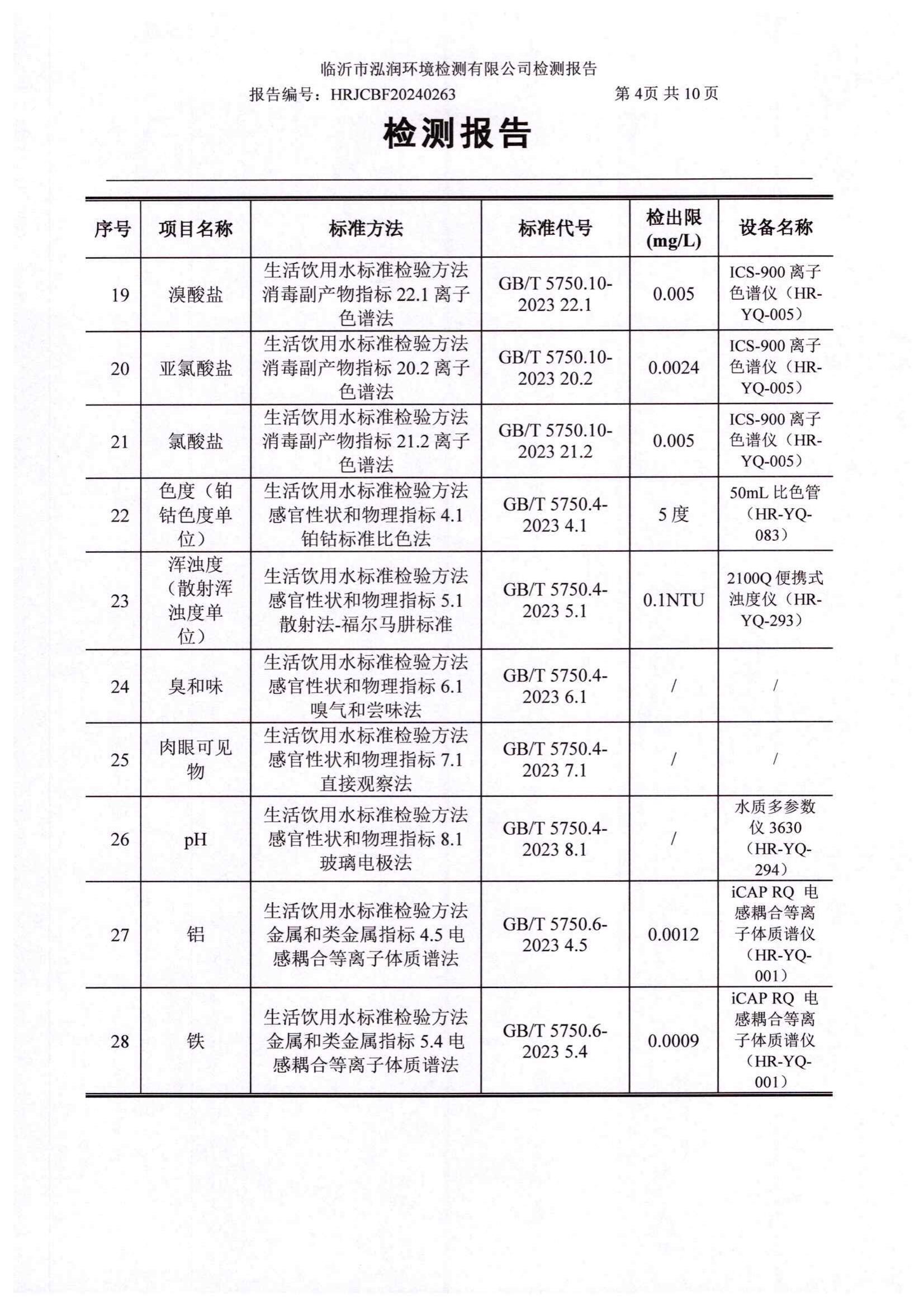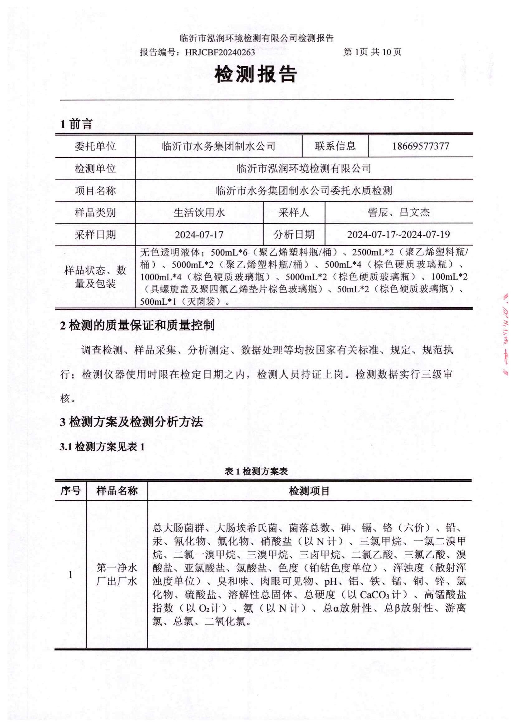 2024年10月出厂水水质检测报告(临沂市水务集团)