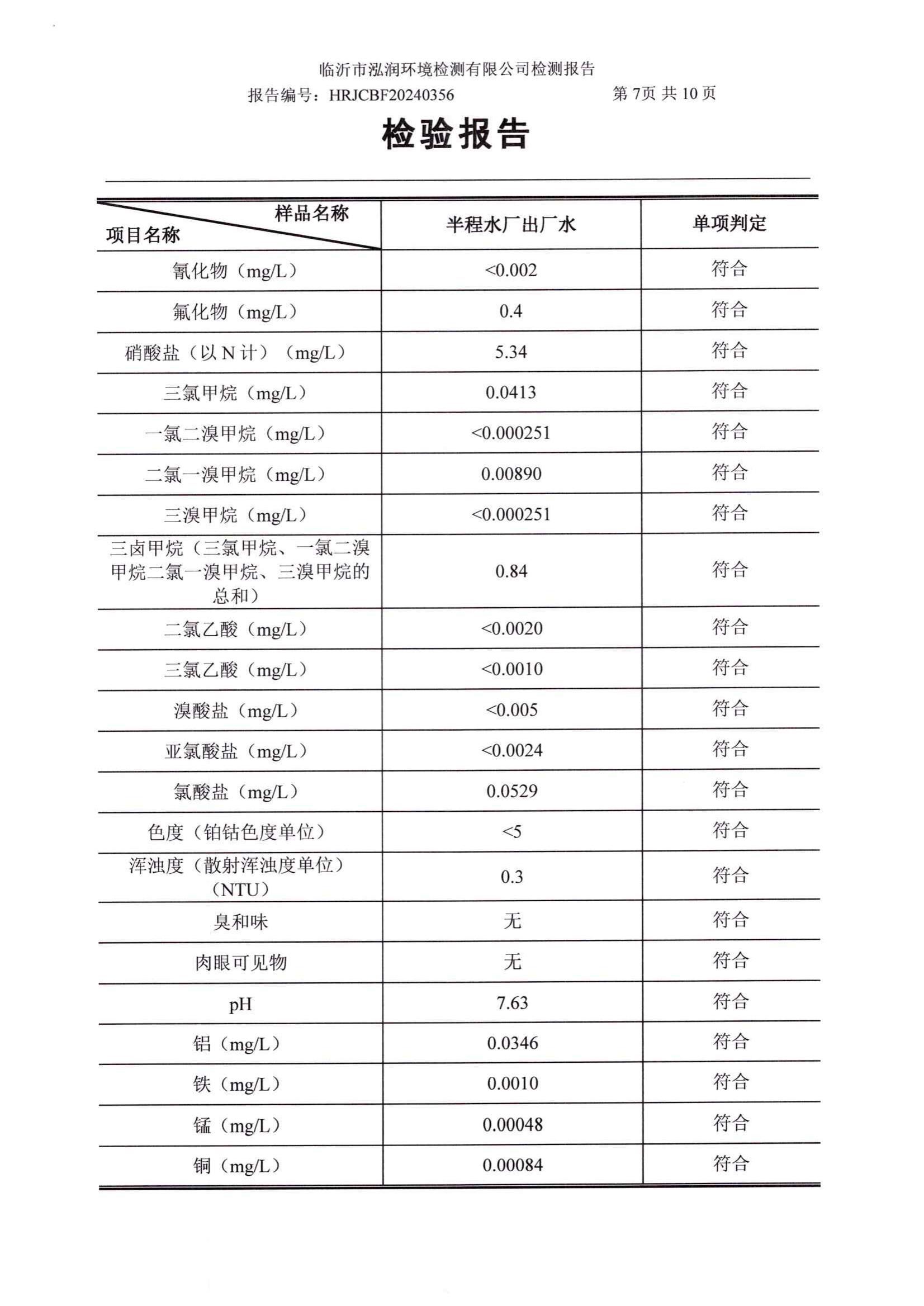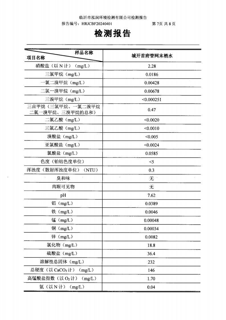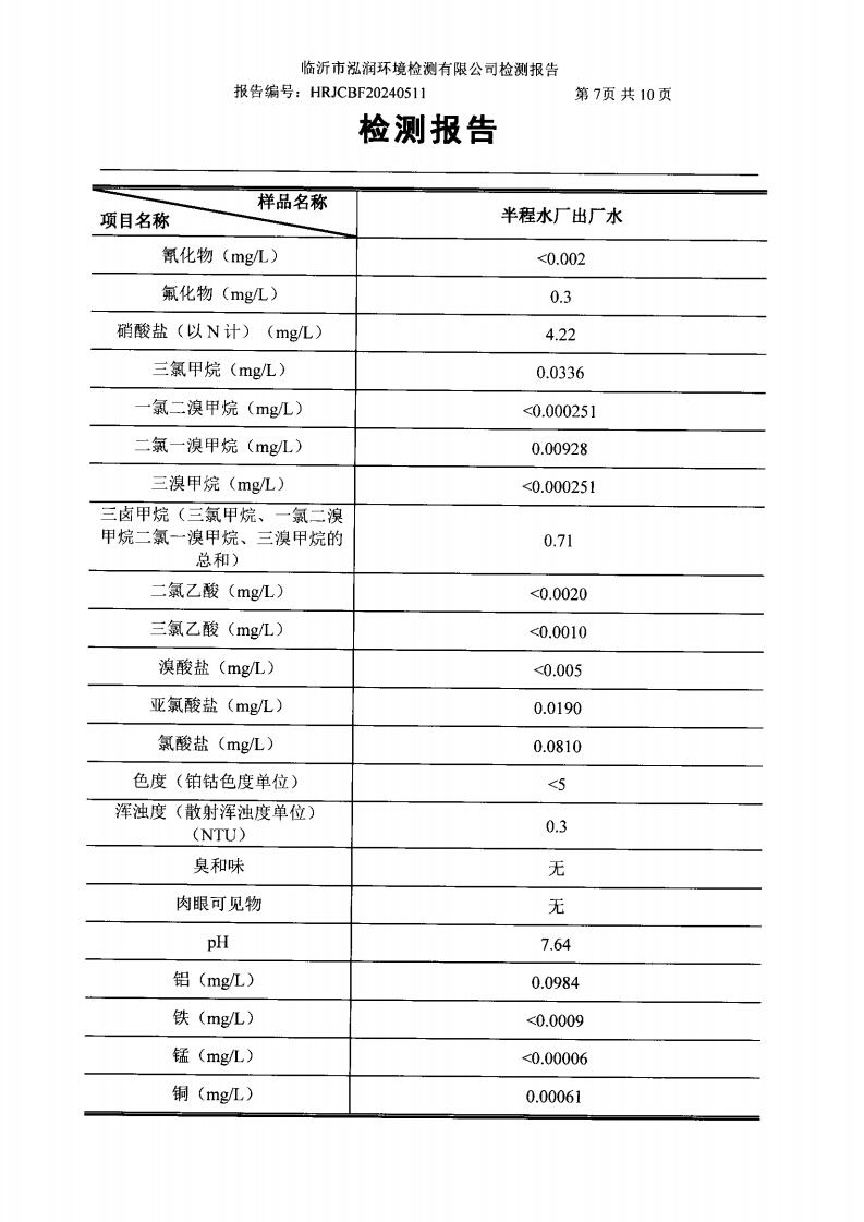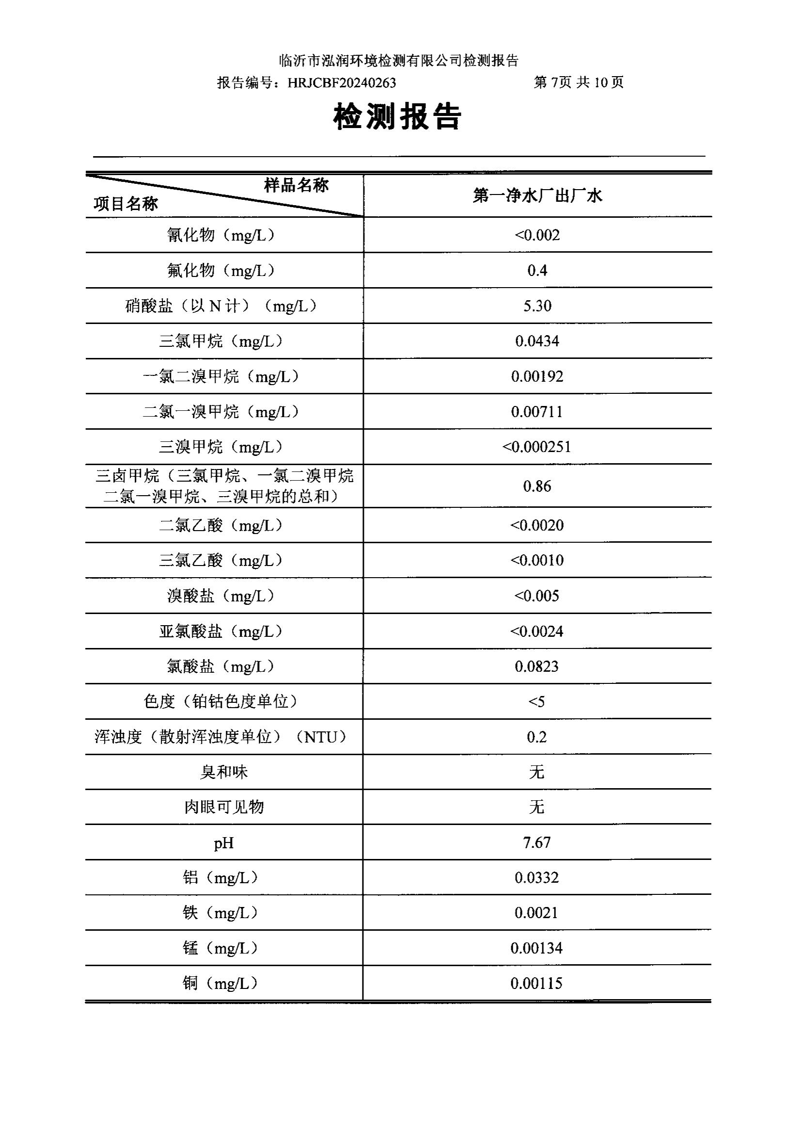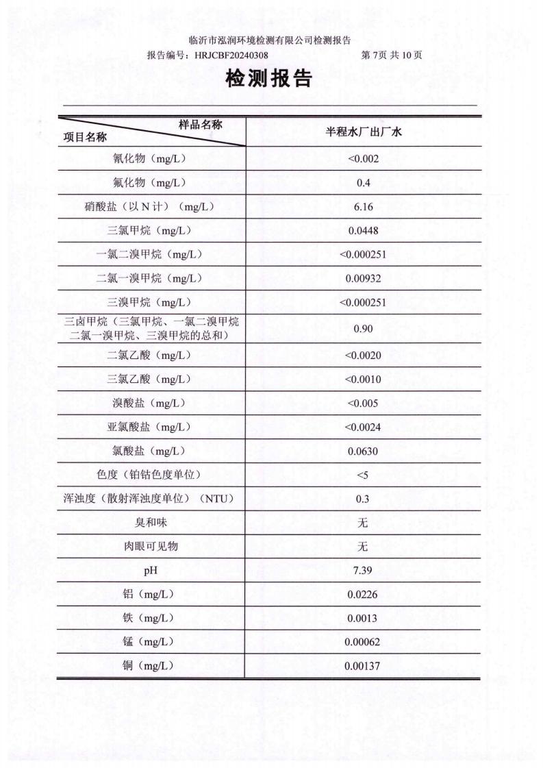 2024年7月出厂水水质检测报告(临沂市水务集团)