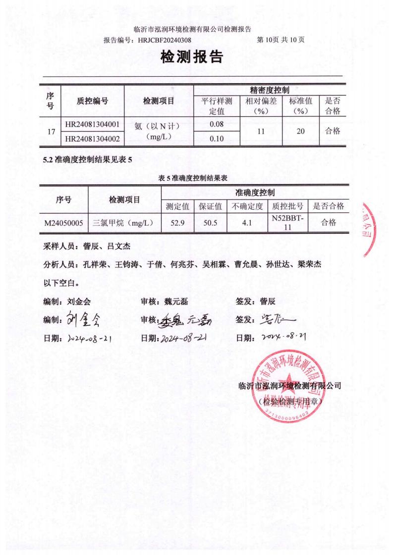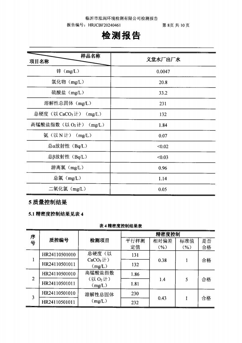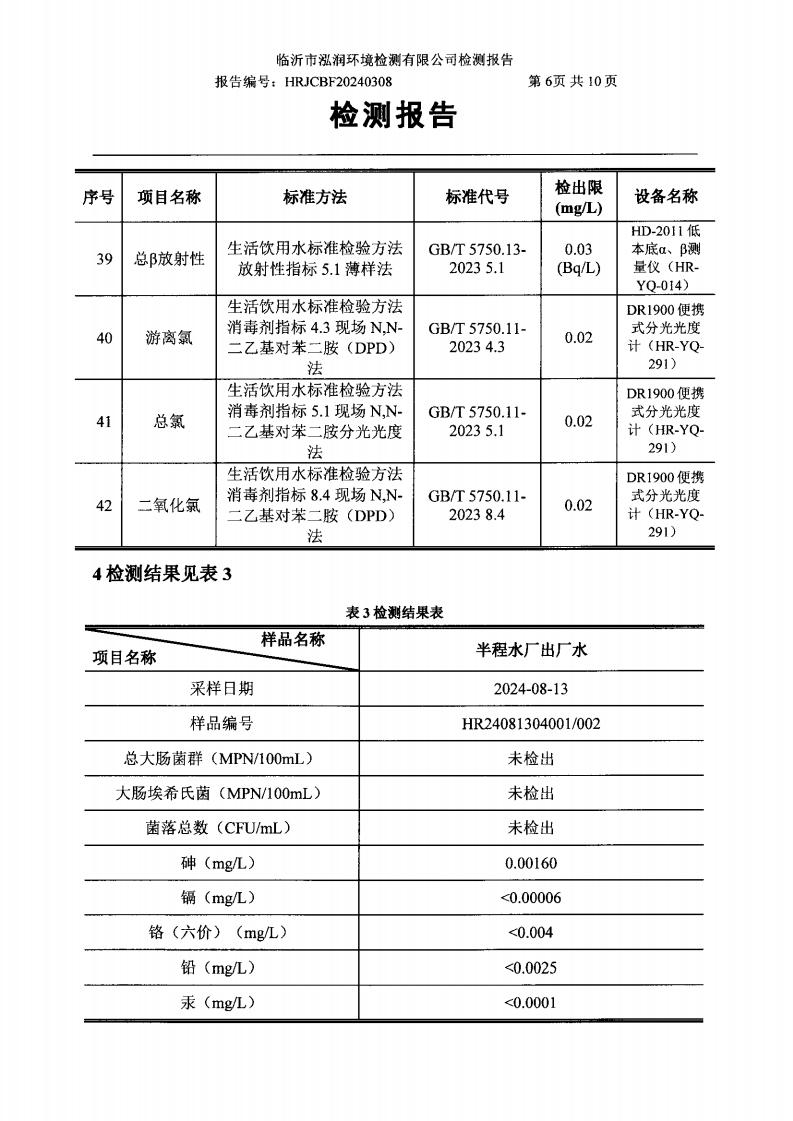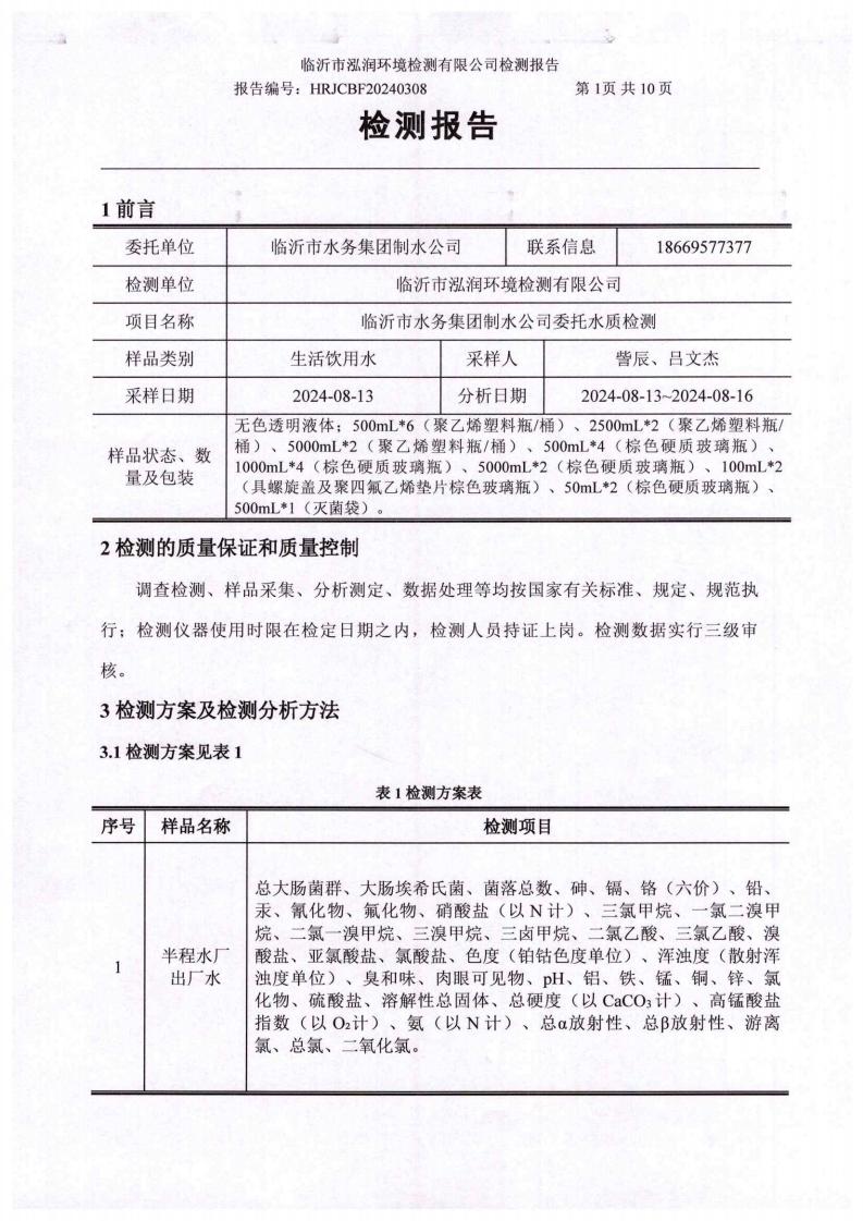 2024年8月出厂水水质检测报告(临沂市水务集团)