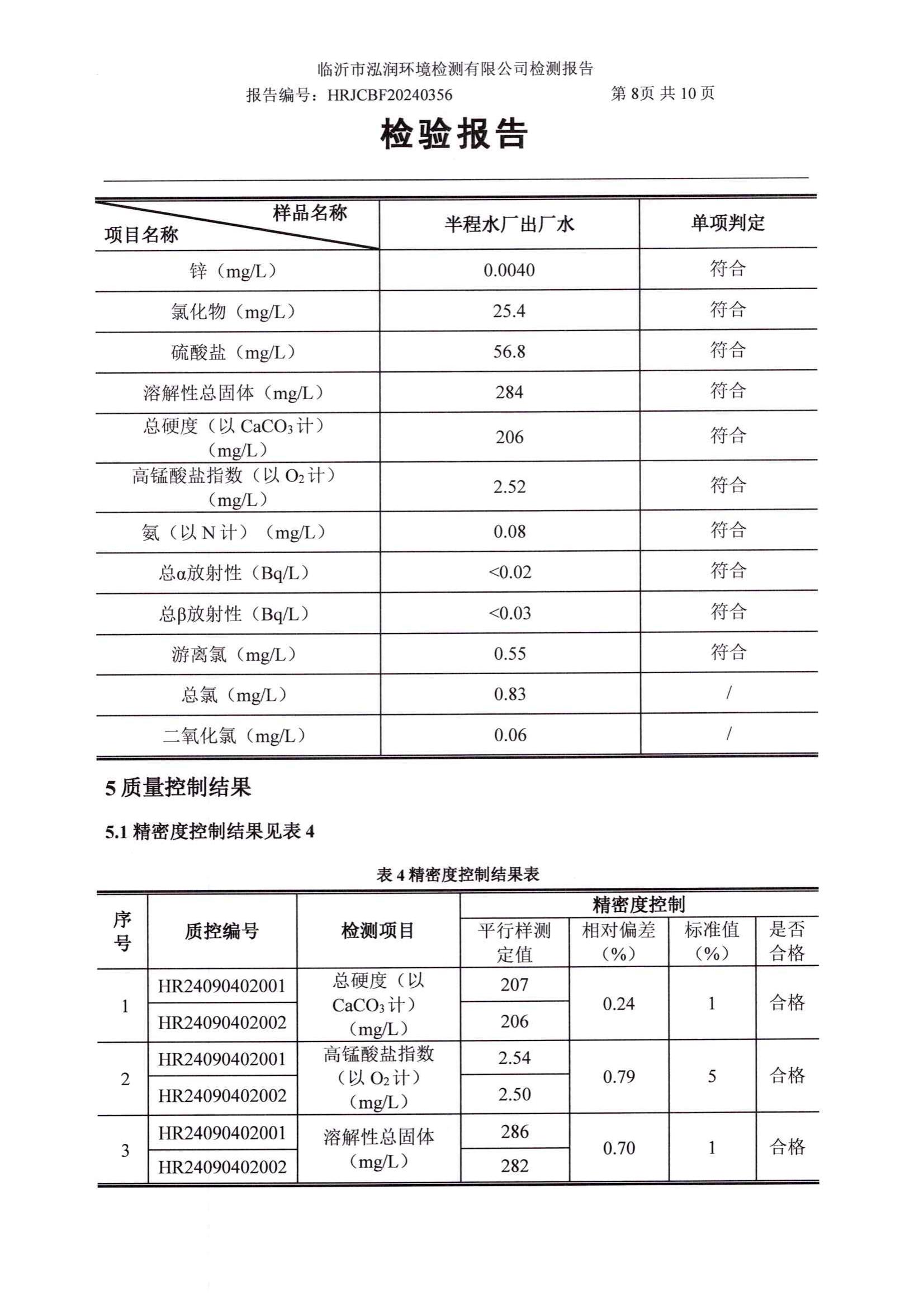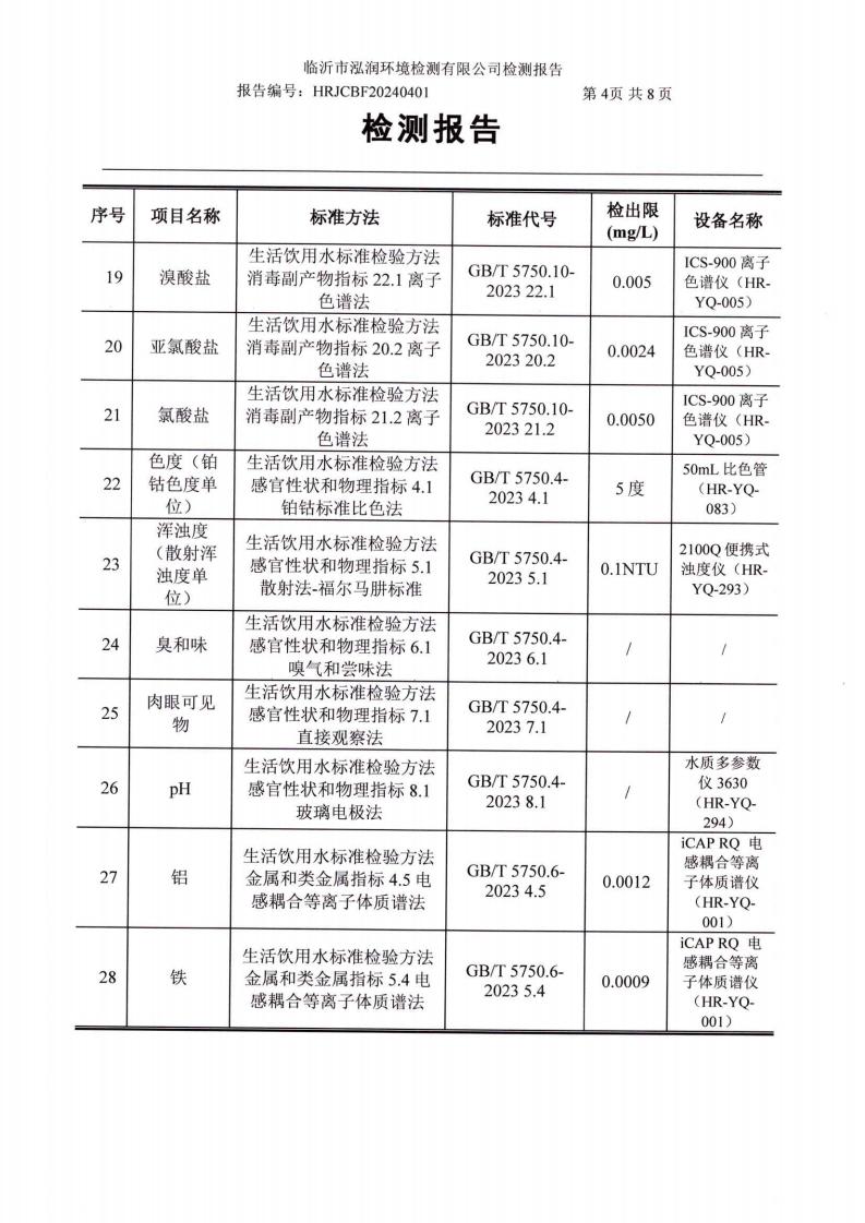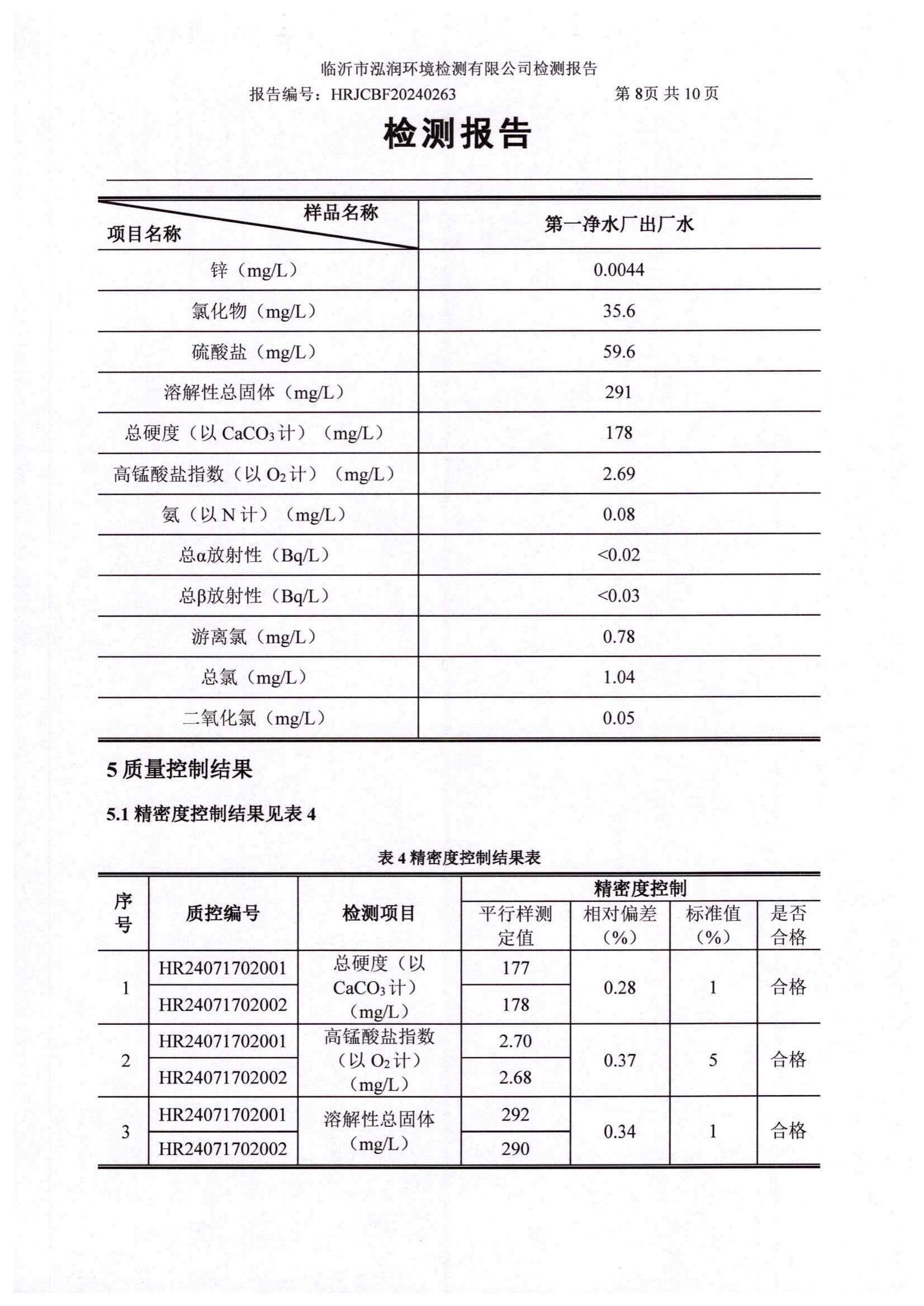 2024年8月出厂水水质检测报告(临沂市水务集团)