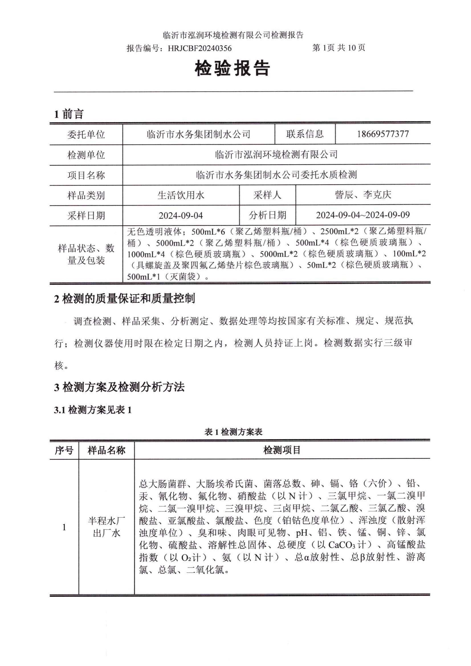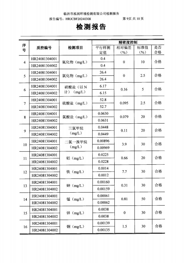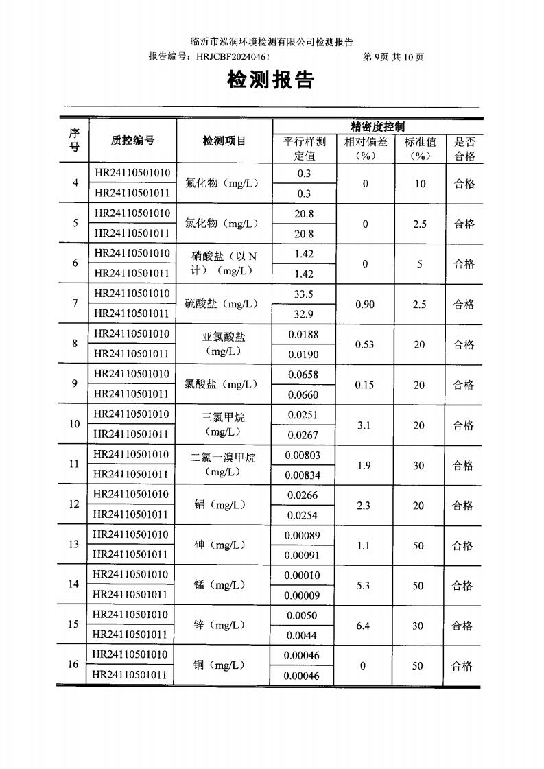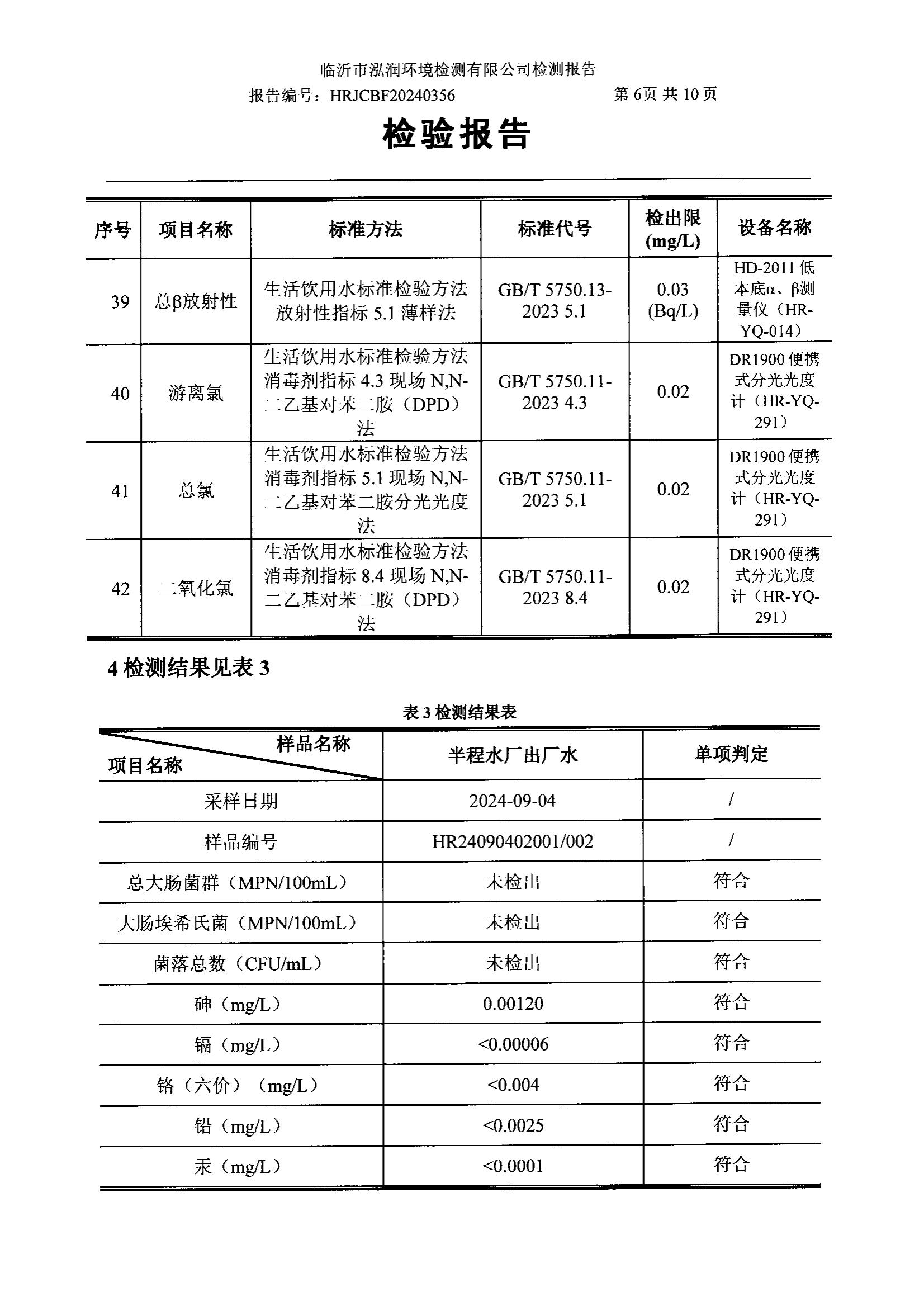 2024年9月出厂水水质检测报告(临沂市水务集团)